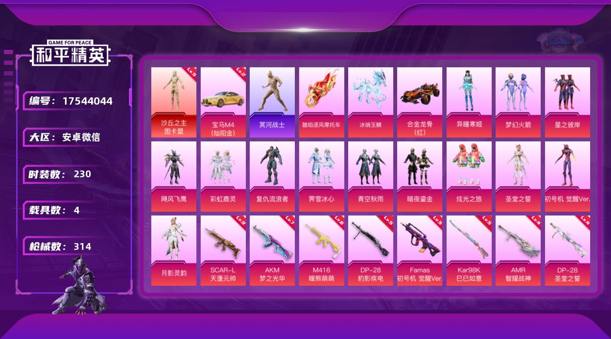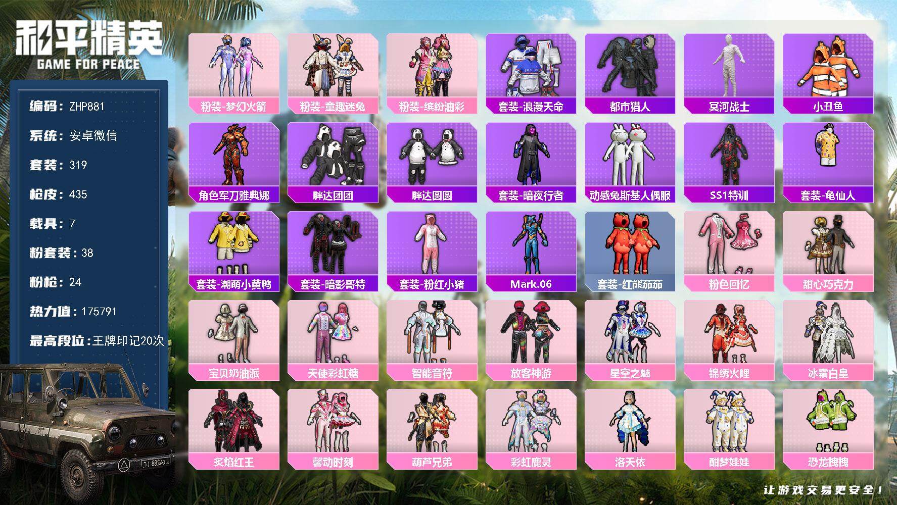 38粉装-24特效枪-7载具-7粉色飞行器-175791热力值-20王牌印记-319套装-435枪皮