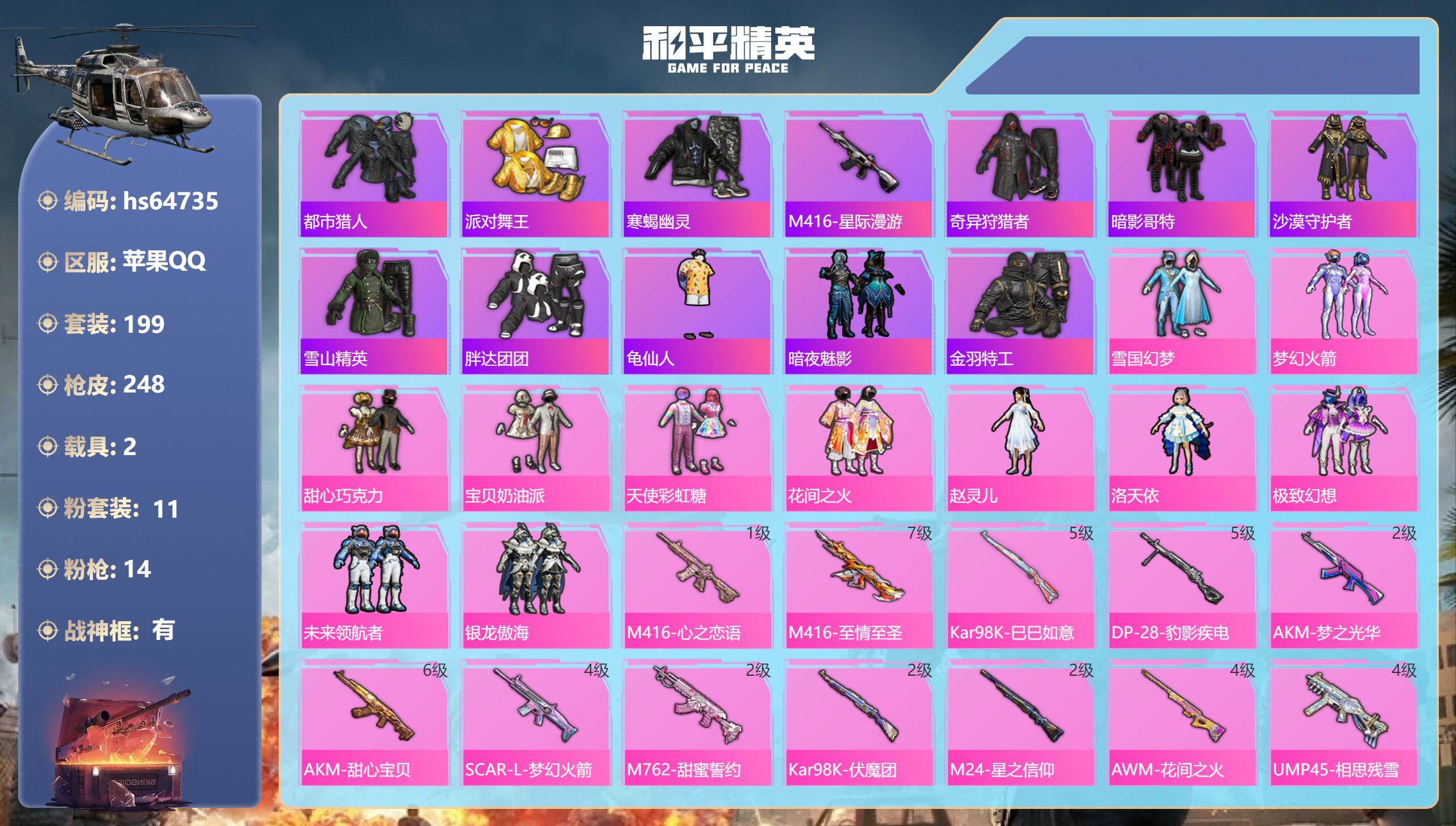 24王牌印记-有战神框-11粉装-14特效枪-2载具-89553热力值-199套装-248枪皮-1卓越印记