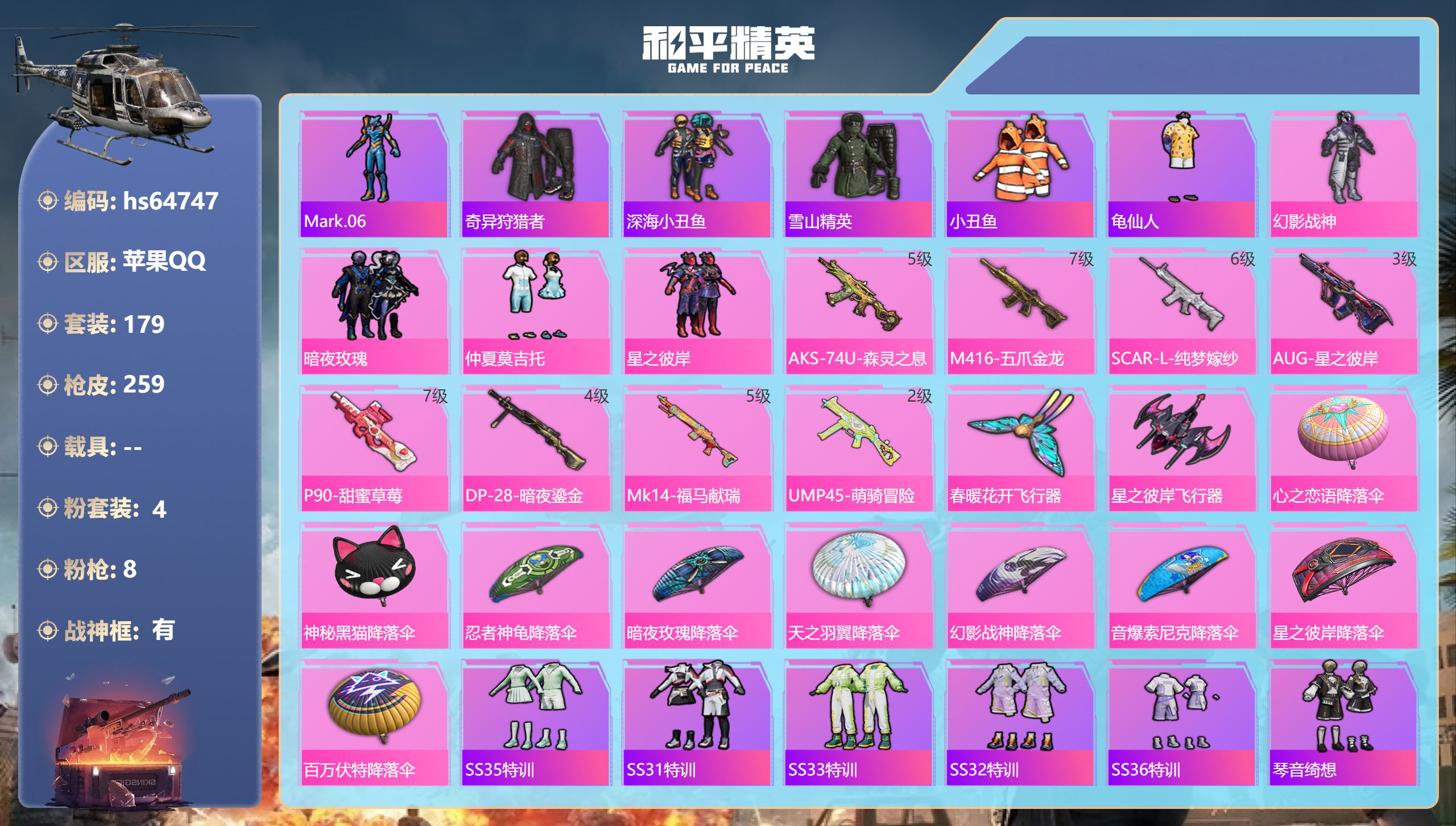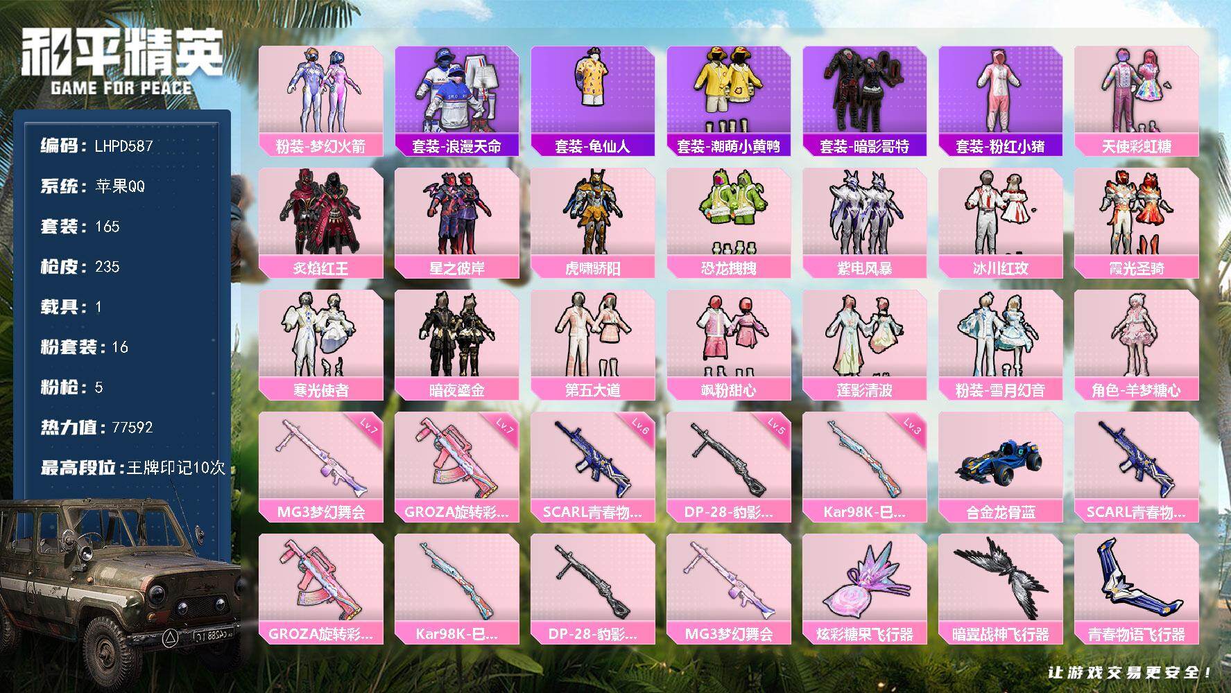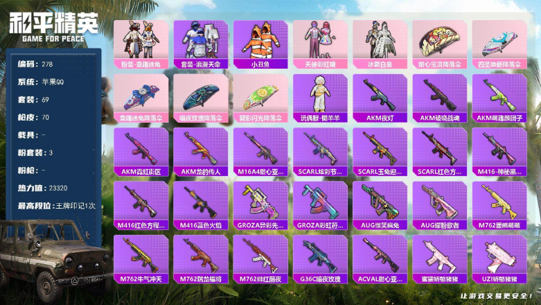 16粉装-5特效枪-1载具-5粉色飞行器-77592热力值-10王牌印记-165套装-235枪皮