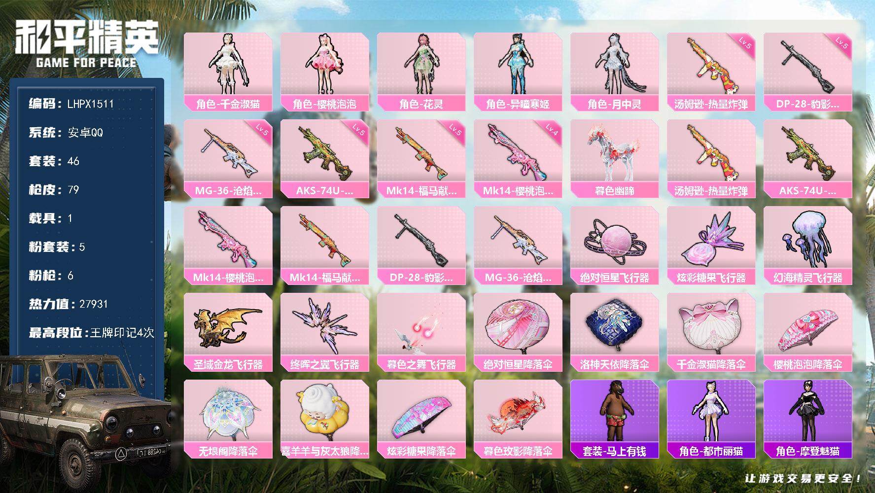 5粉装-6特效枪-1载具-6粉色飞行器-27931热力值-4王牌印记-46套装-79枪皮
