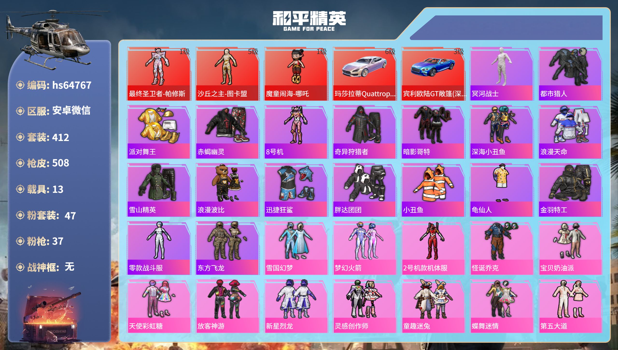 27王牌印记-3红装-47粉装-37特效枪-13载具-热力值-412套装-508枪皮