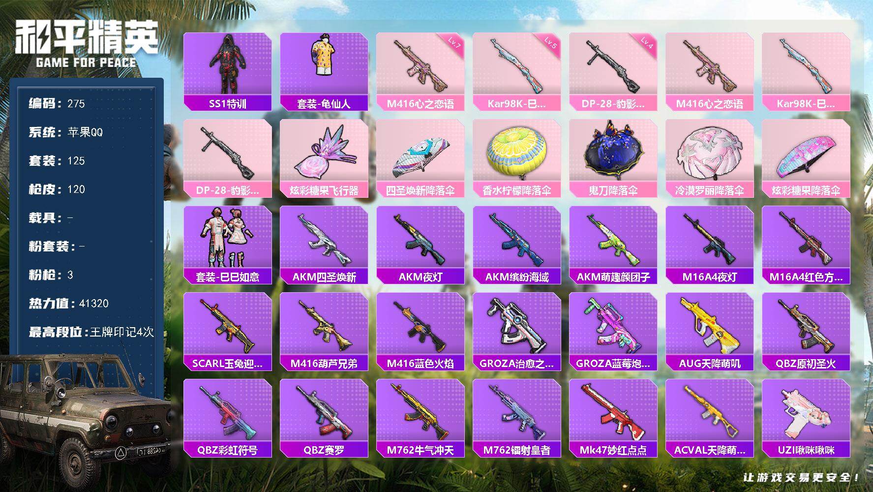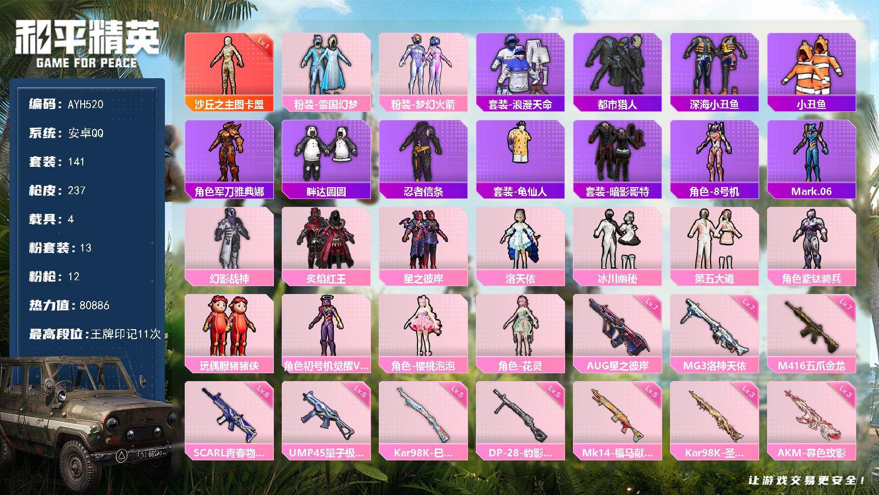 1神装-13粉装-12特效枪-4载具-8粉色飞行器-80886热力值-11王牌印记-141套装-237枪皮