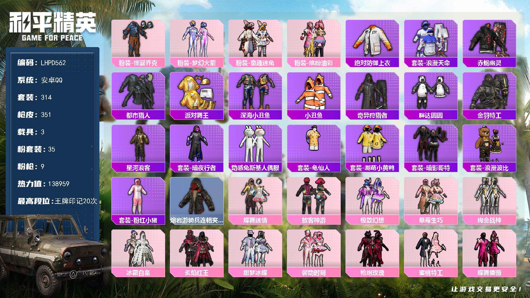 35粉装-9特效枪-3载具-9粉色飞行器-138959热力值-20王牌印记-314套装-351枪皮