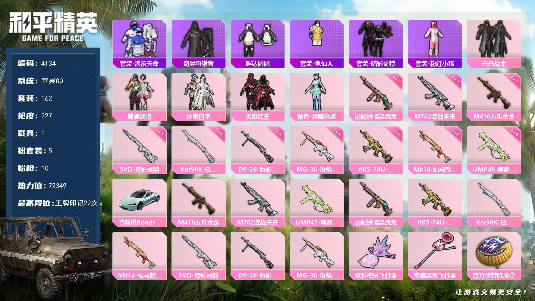 5粉装-10特效枪-1载具-2粉色飞行器-72349热力值-22王牌印记-162套装-227枪皮