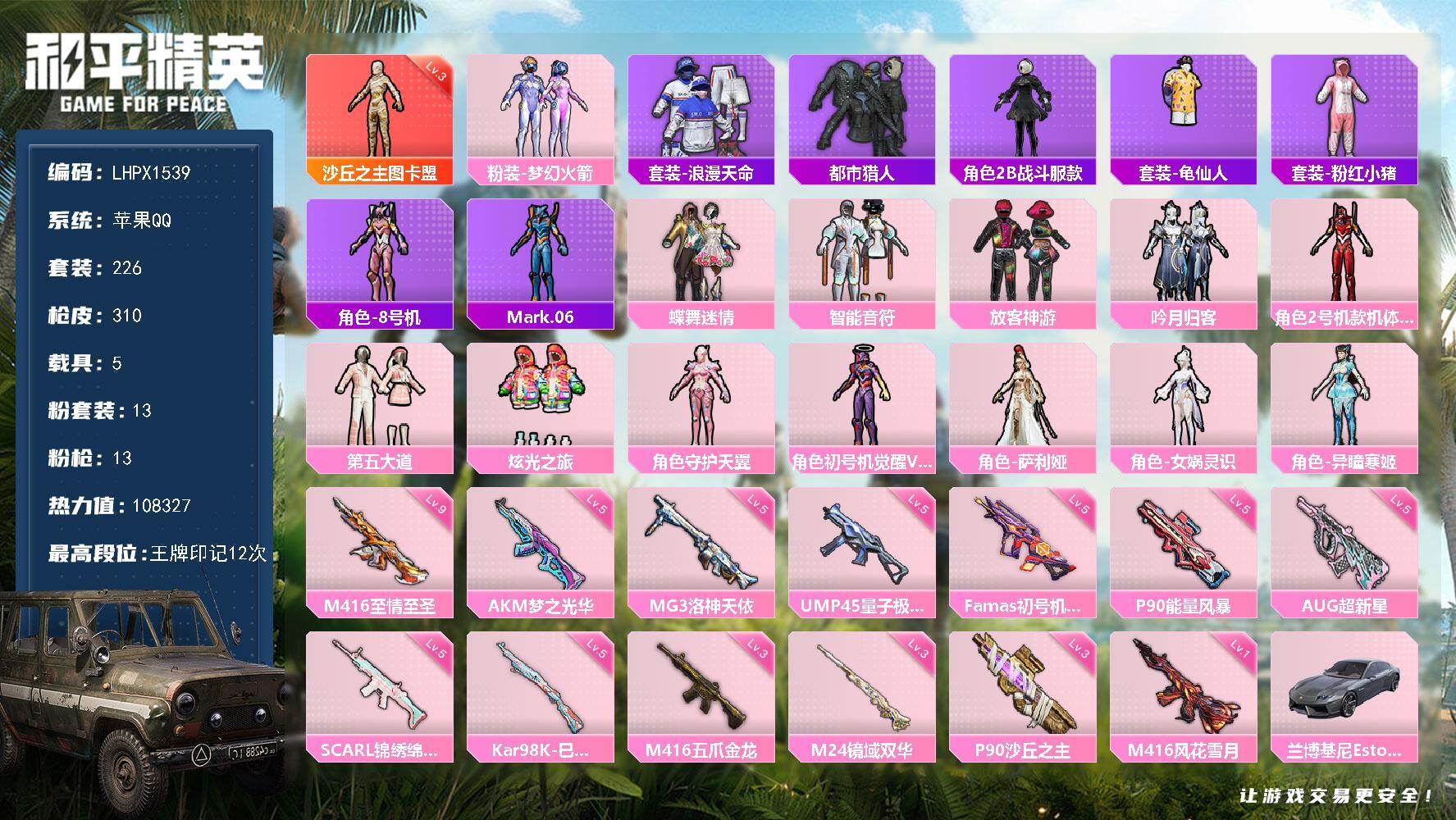 1神装-13粉装-13特效枪-5载具-6粉色飞行器-108327热力值-12王牌印记-226套装-310枪皮