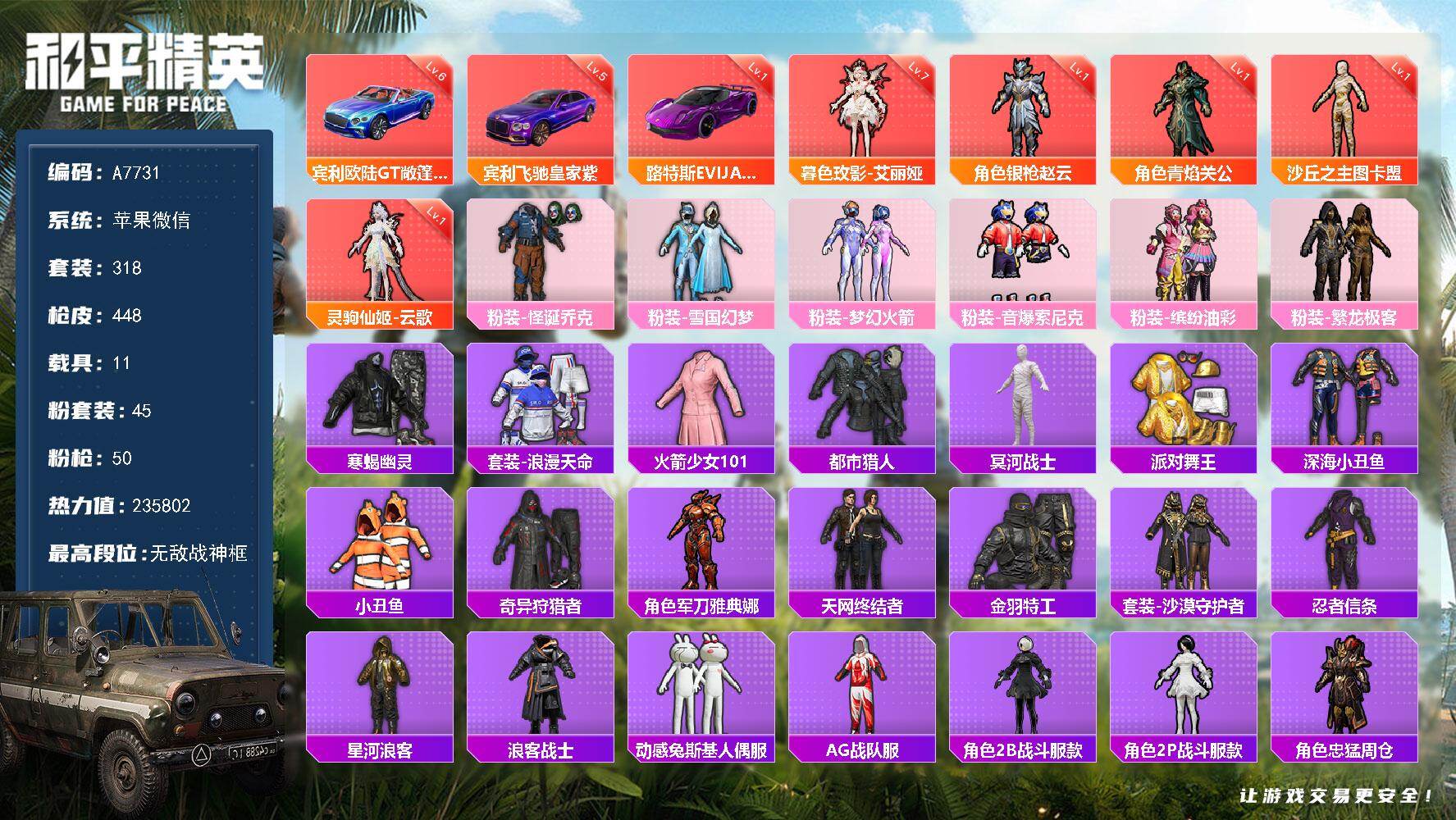 无敌战神框-5神装-45粉装-50特效枪-11载具-18粉色飞行器-235802热力值-16王牌印记-318套装-448枪皮