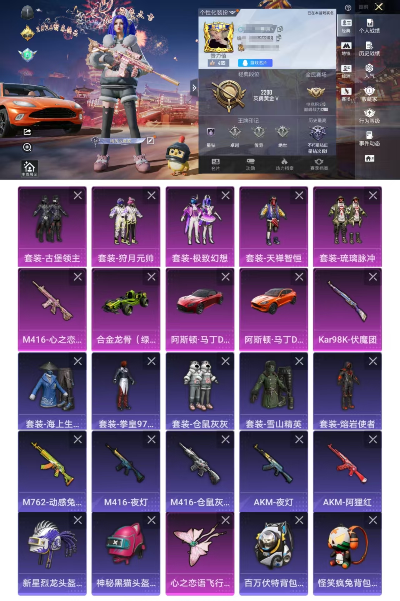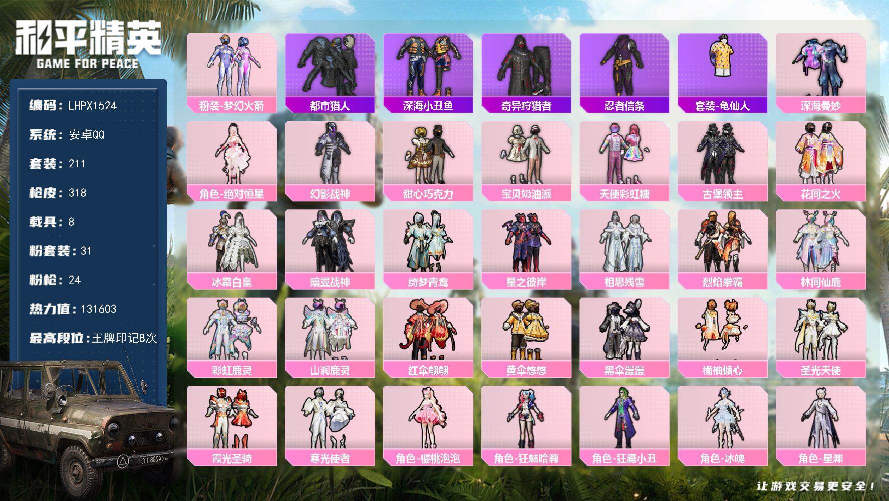 31粉装-24特效枪-8载具-19粉色飞行器-131603热力值-8王牌印记-211套装-318枪皮
