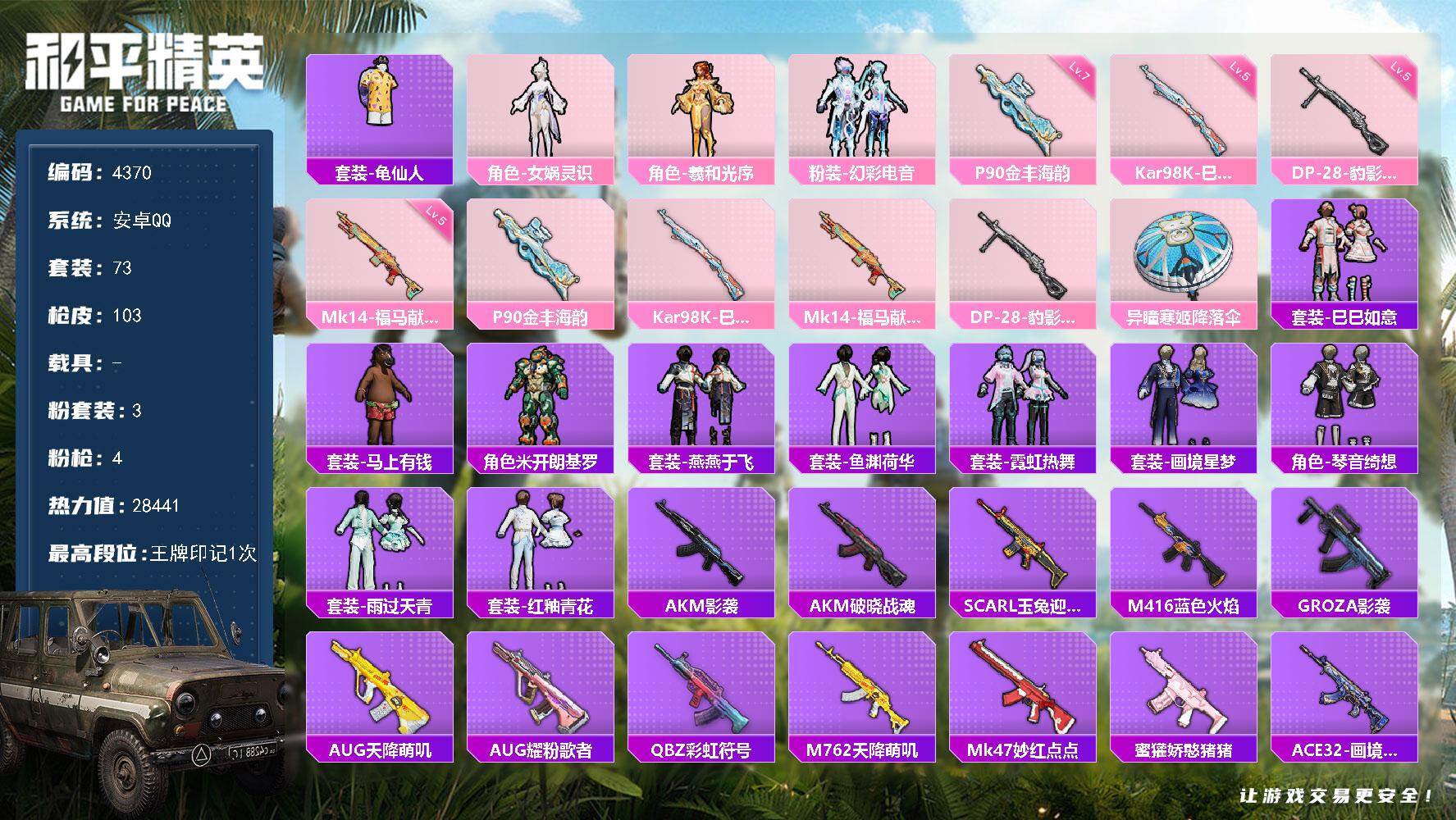 安卓 手Q-5粉装-8特效枪-0载具-3粉色飞行器-50175热力值-12王牌印
