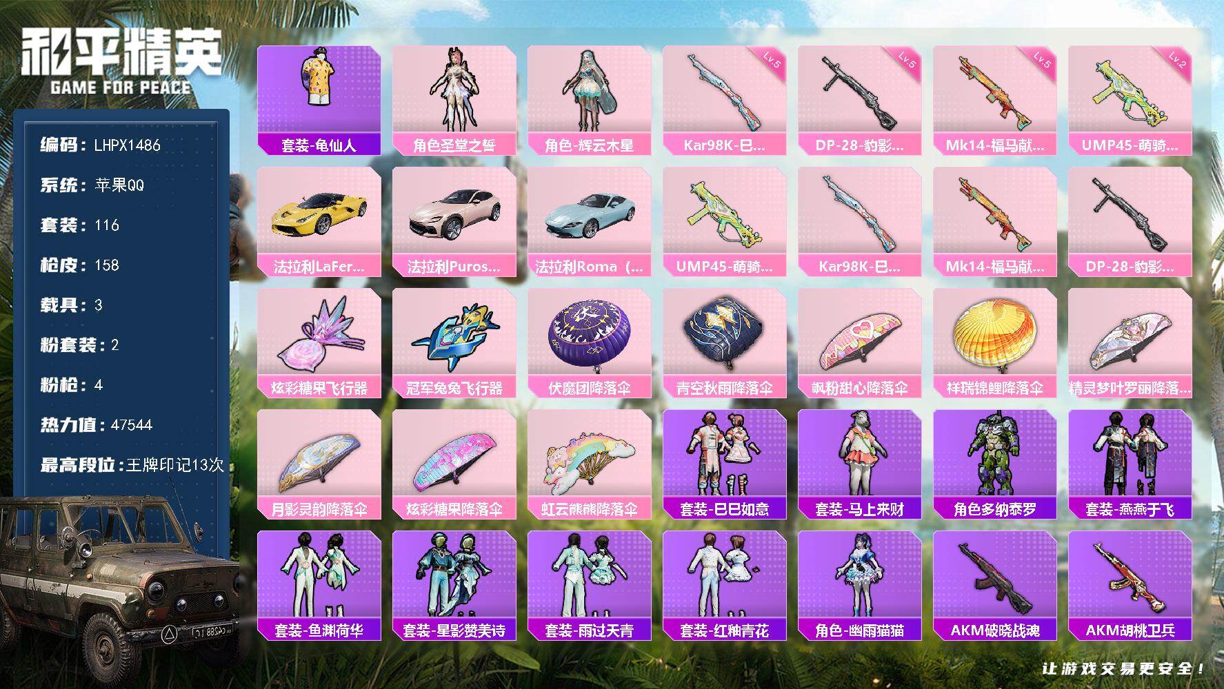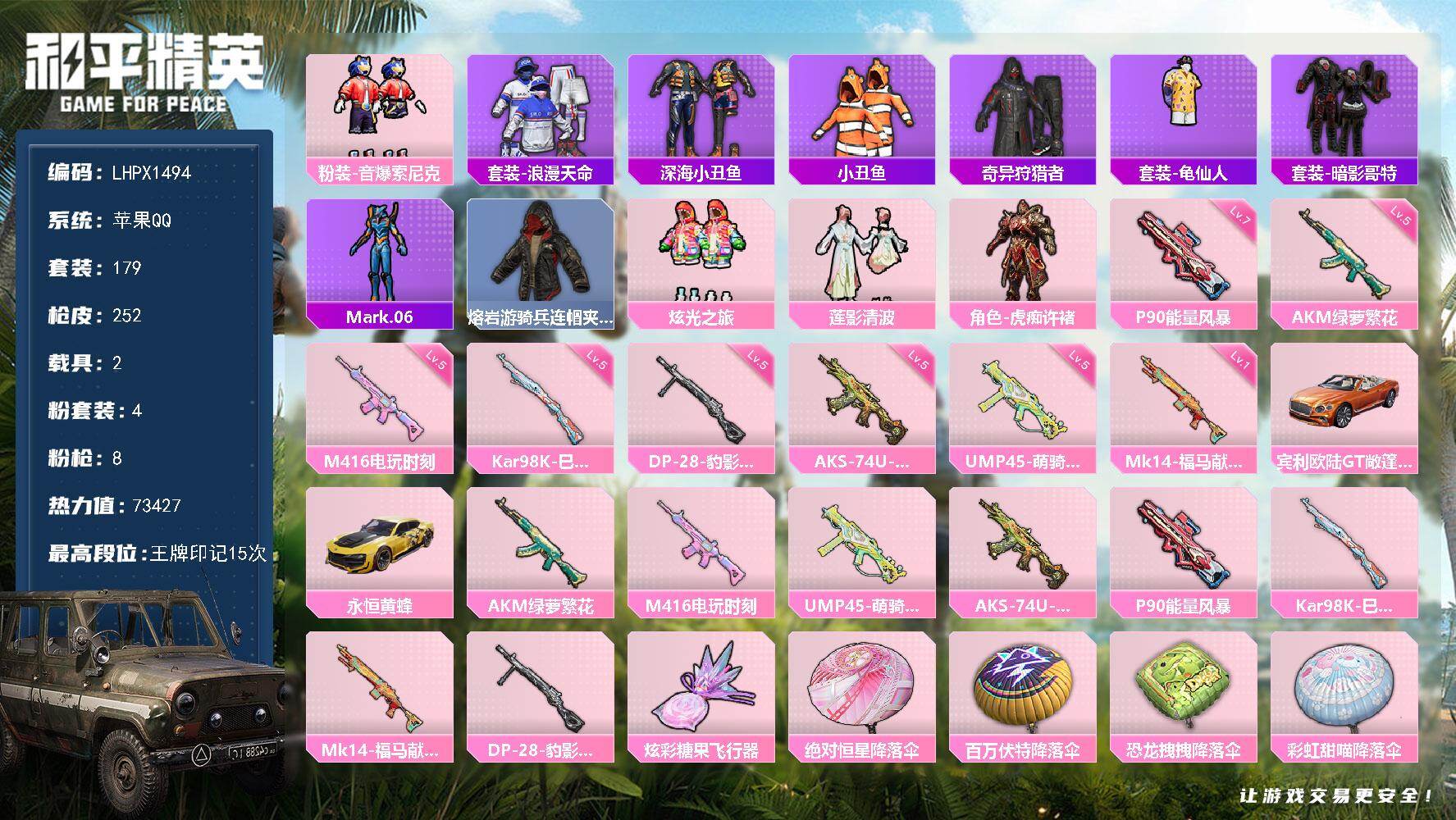 【店主推荐捡漏号!可直接换绑】苹果 手Q-6粉装-4特效枪-0载具-0粉色飞行器
