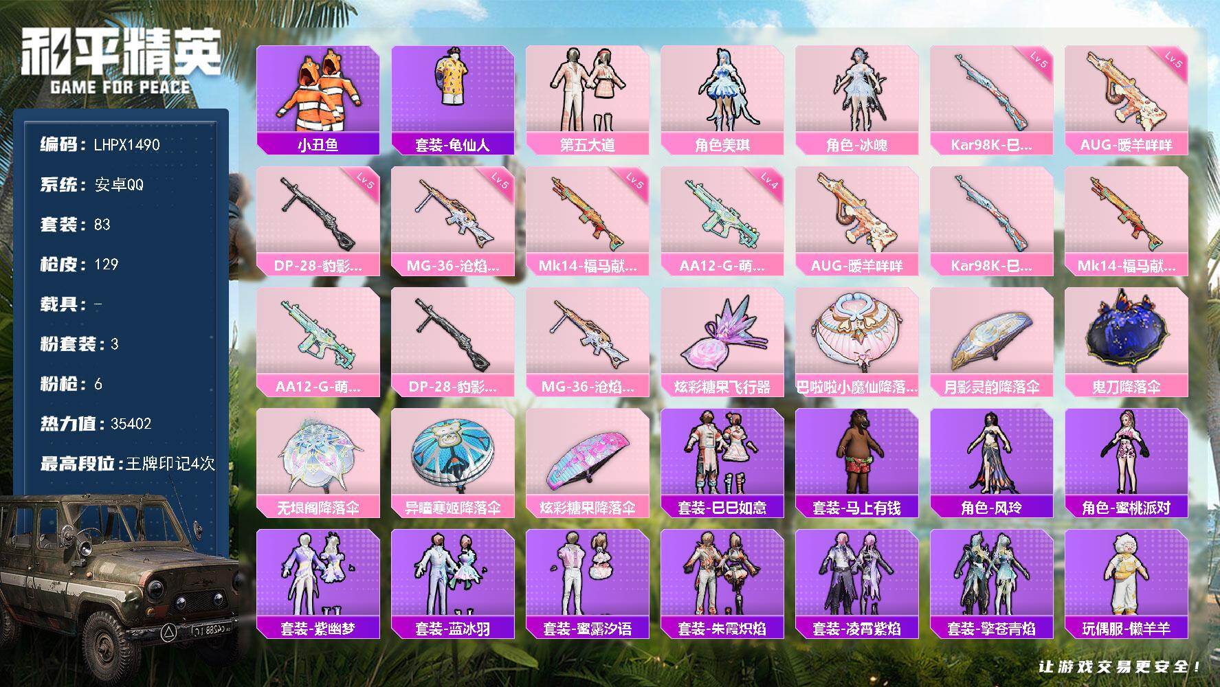 【可二次】安卓手Q-2载具-2粉装-5特效枪-133套装-168枪皮-11王牌印