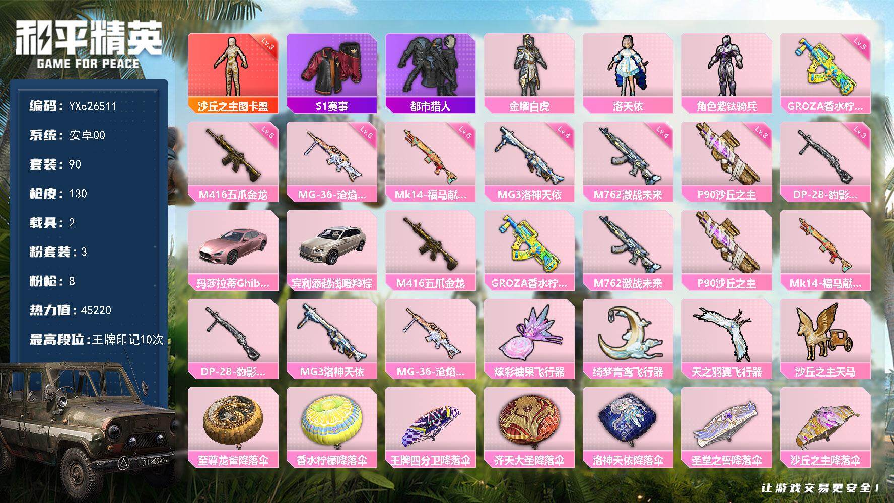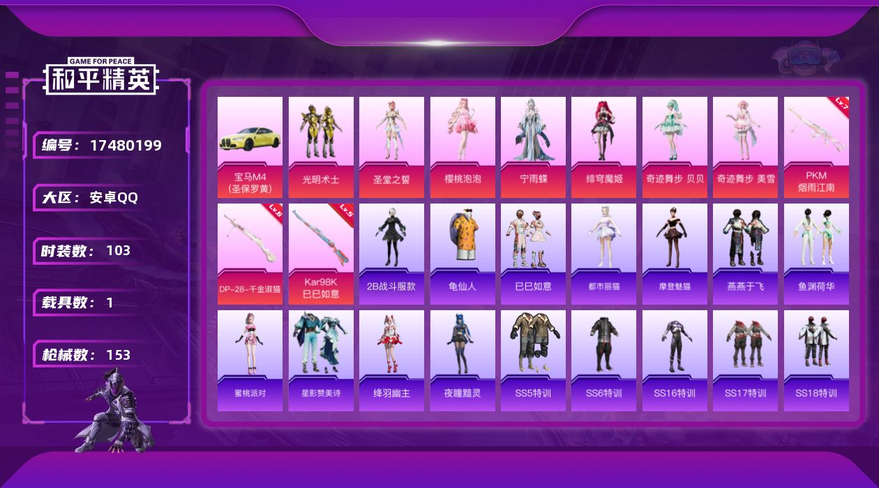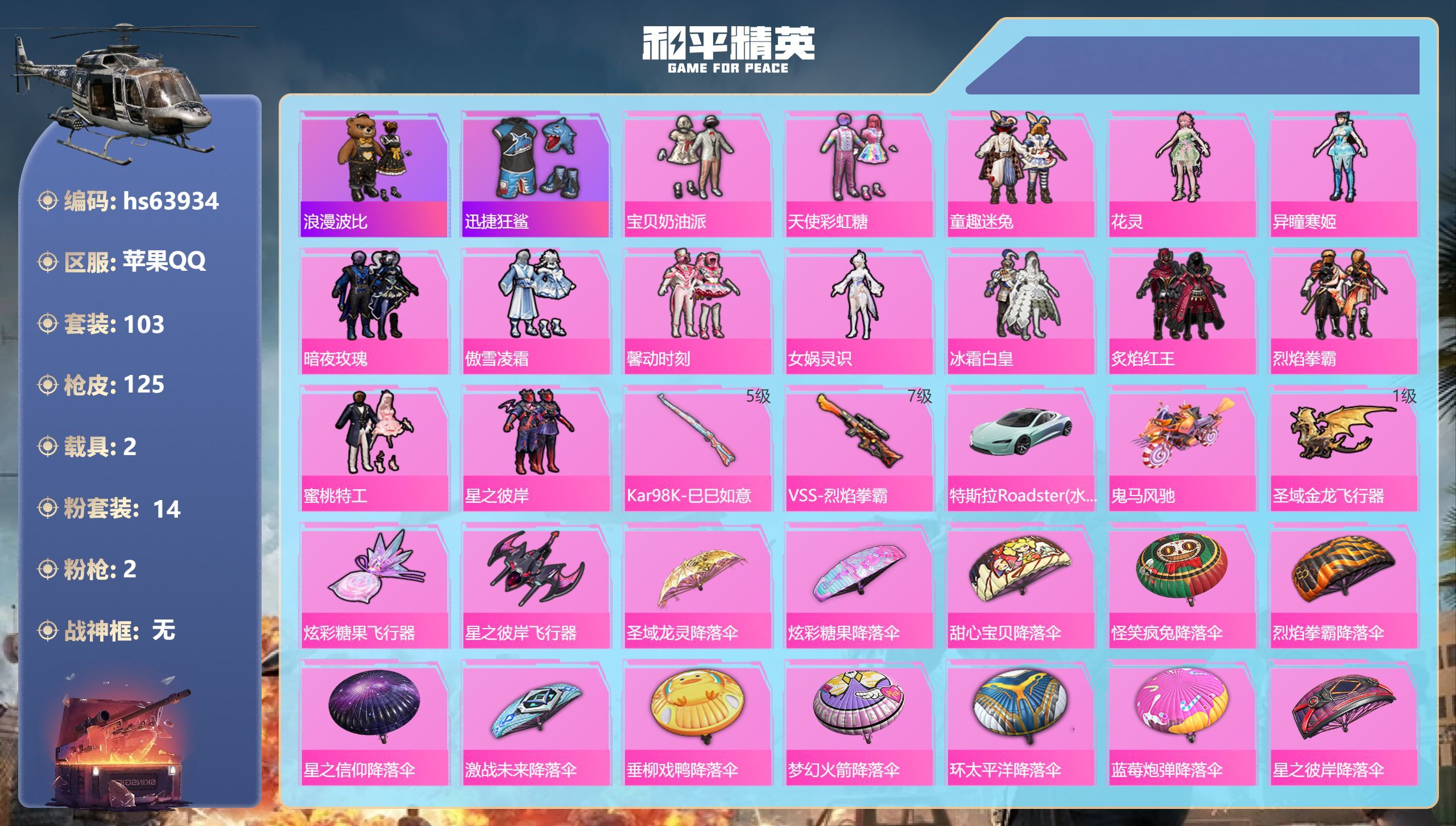 苹果手Q-2王牌印记-14粉装-2特效枪-2载具-48308热力值-103套装-125枪皮【14粉装
