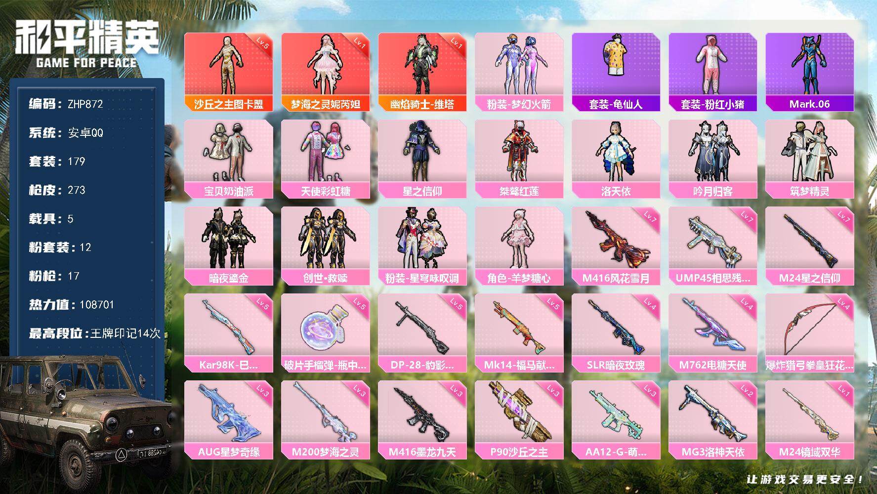 高质量连体号!3神装-12粉装-17特效枪-5载具-10粉色飞行器-108701热力值-14王牌印记-179套装-273枪皮=王者V9-319皮肤5典藏2珍品18传3星传1天幕