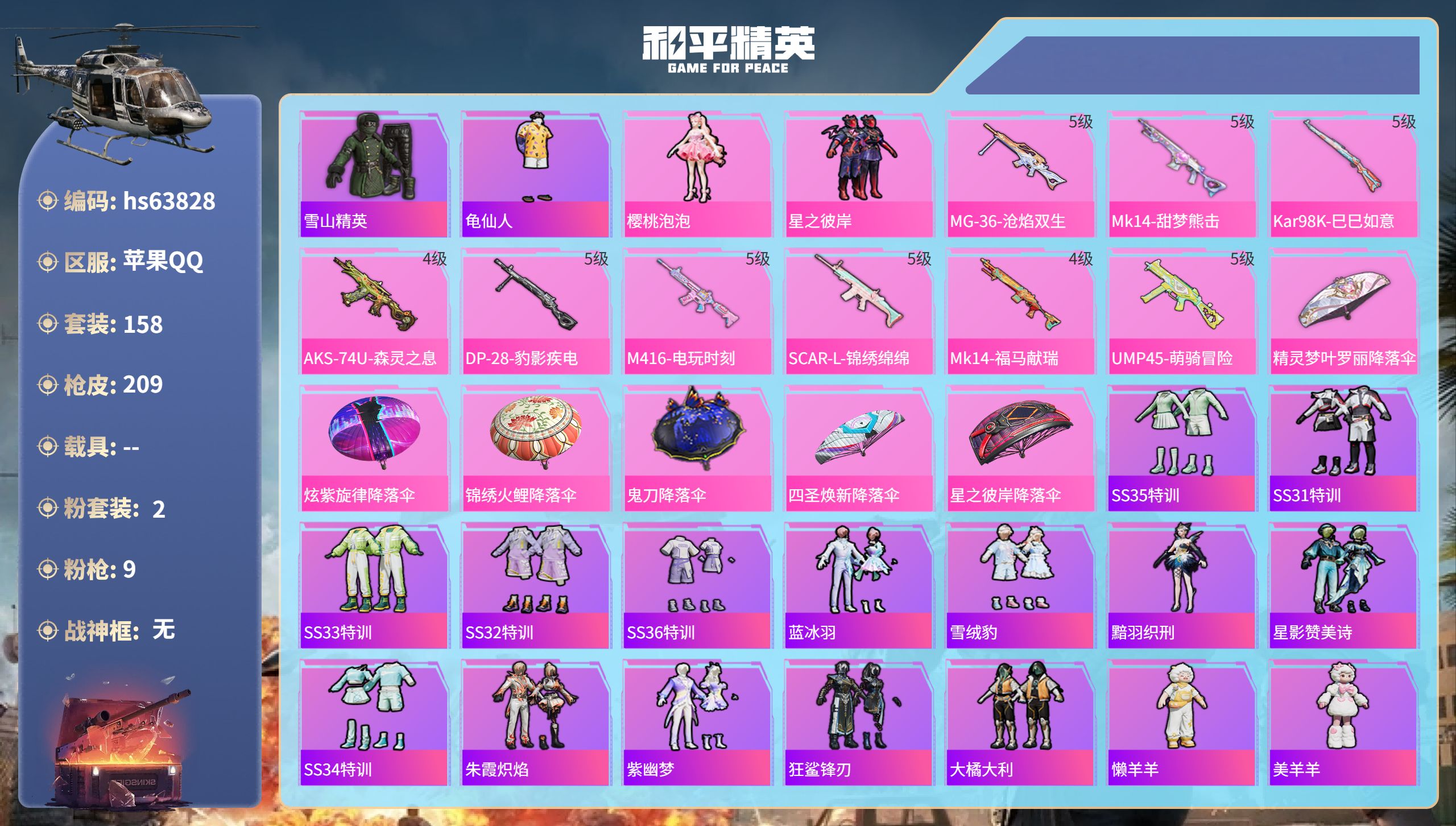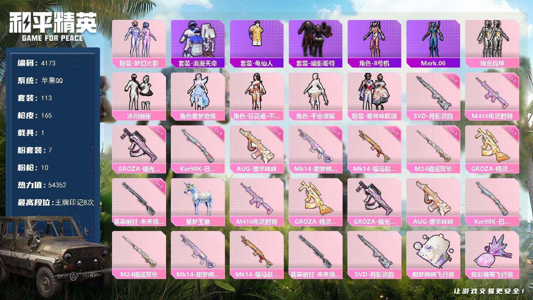 苹果 手Q-1神装-12粉装-12特效枪-3载具-6粉色飞行器-99148热力值