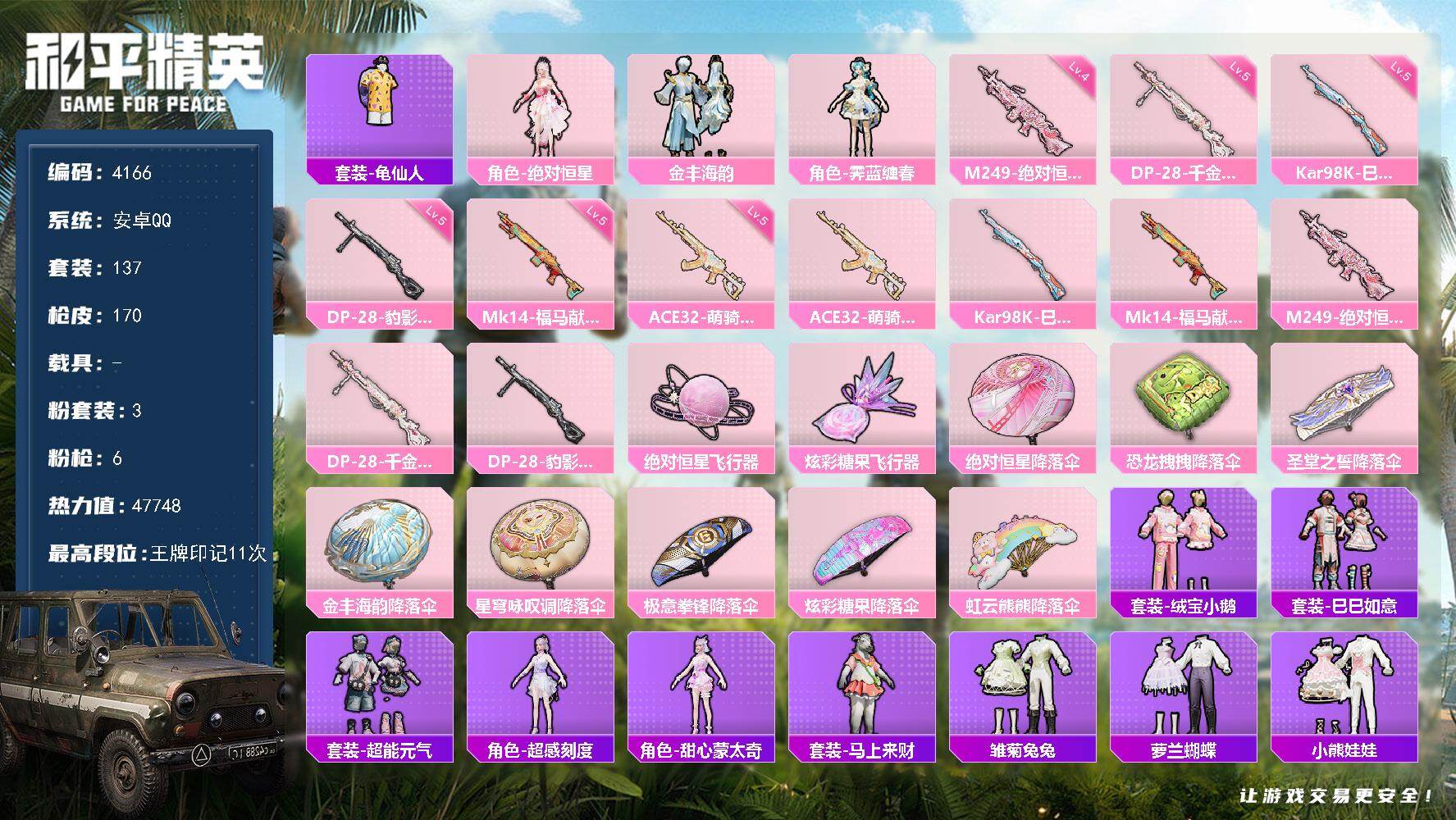 3粉装-6特效枪-0载具-2粉色飞行器-47748热力值-11王牌印记-137套装-170枪皮