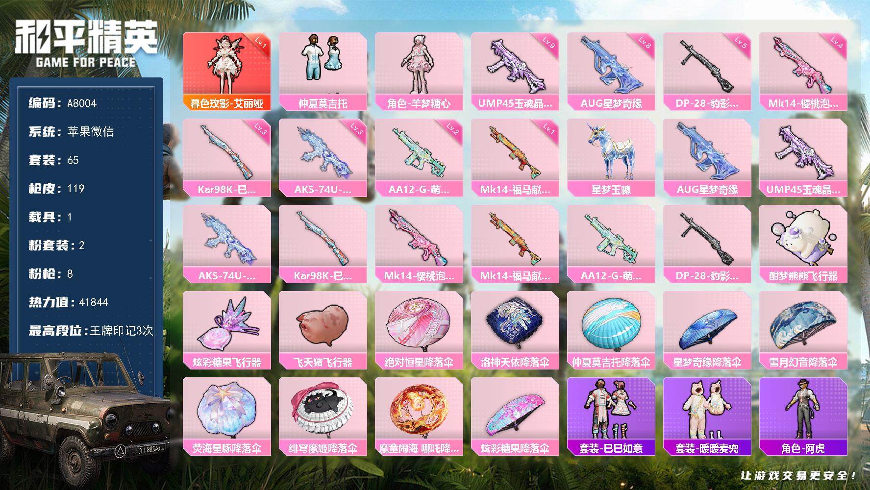 1神装-2粉装-8特效枪-1载具-4粉色飞行器-41844热力值-3王牌印记-65套装-119枪皮