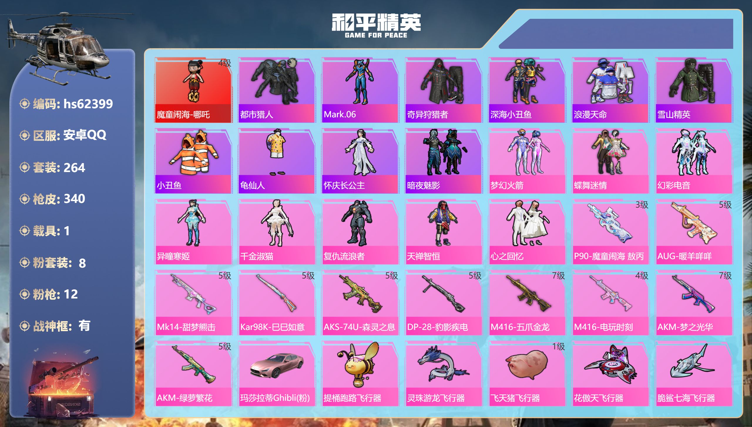 安卓 手Q-2粉装-4特效枪-1载具-1粉色飞行器-50594热力值-8王牌印