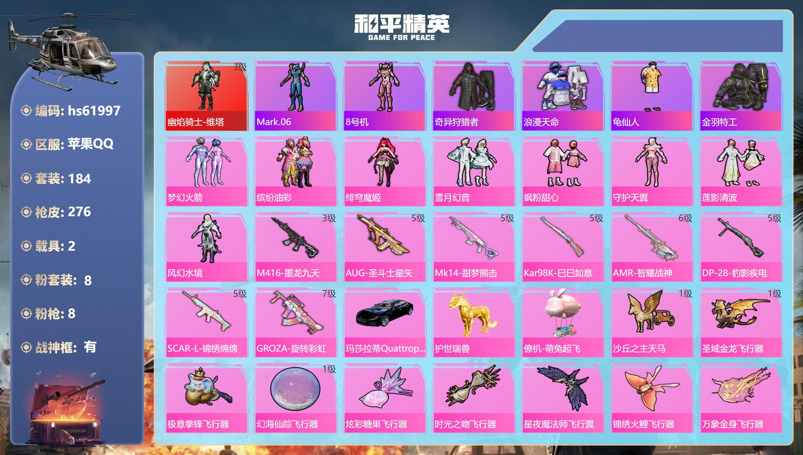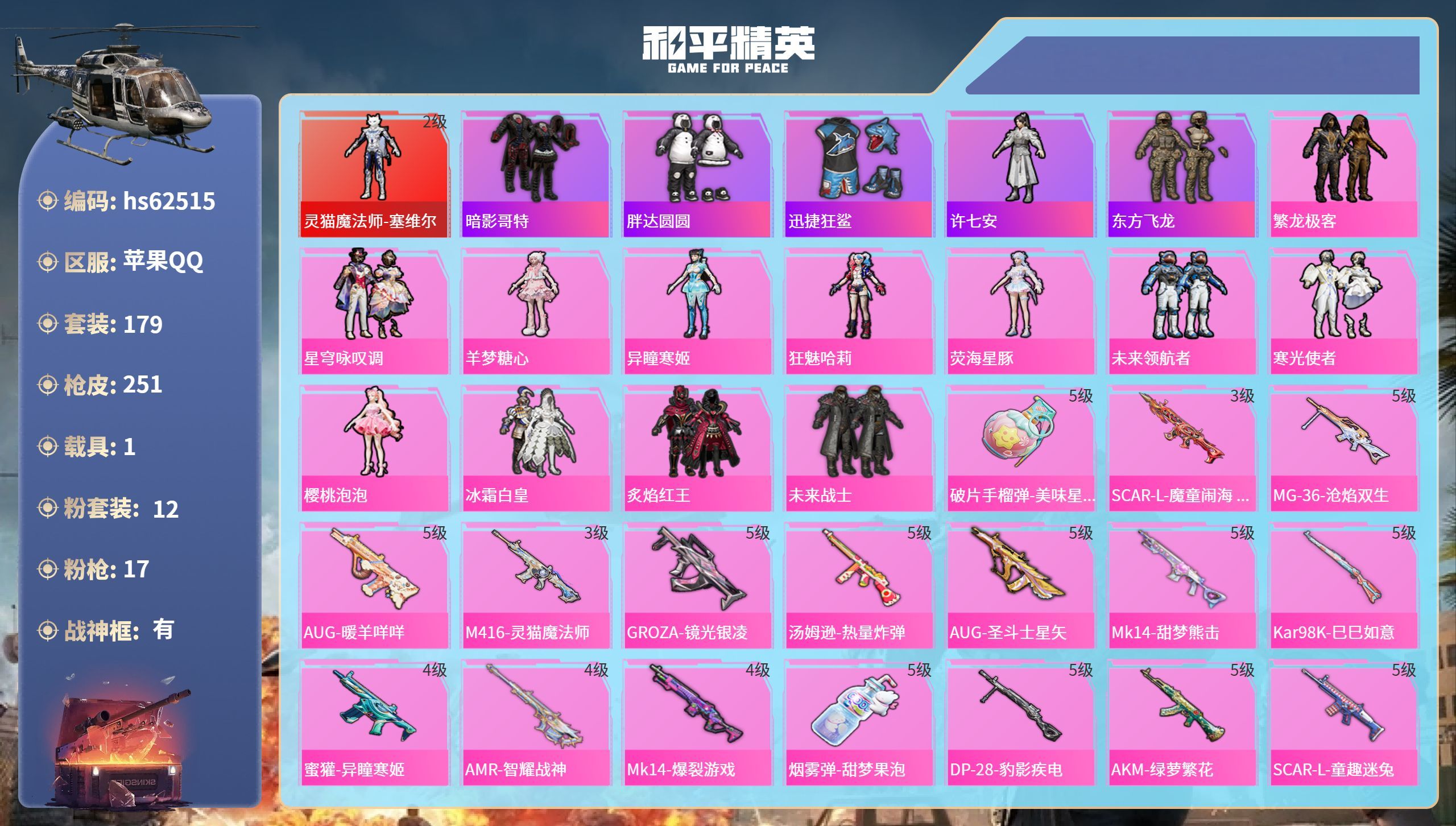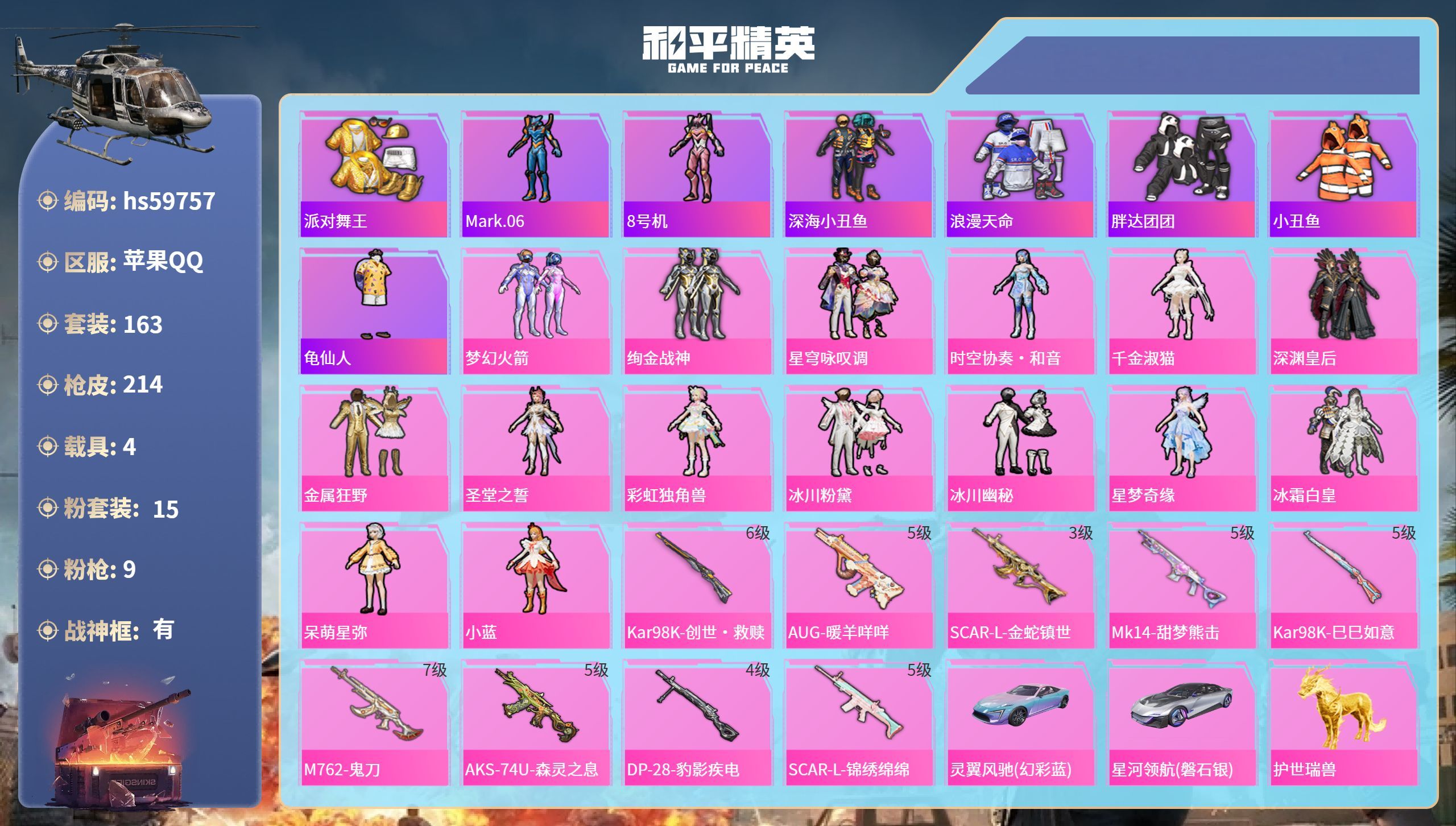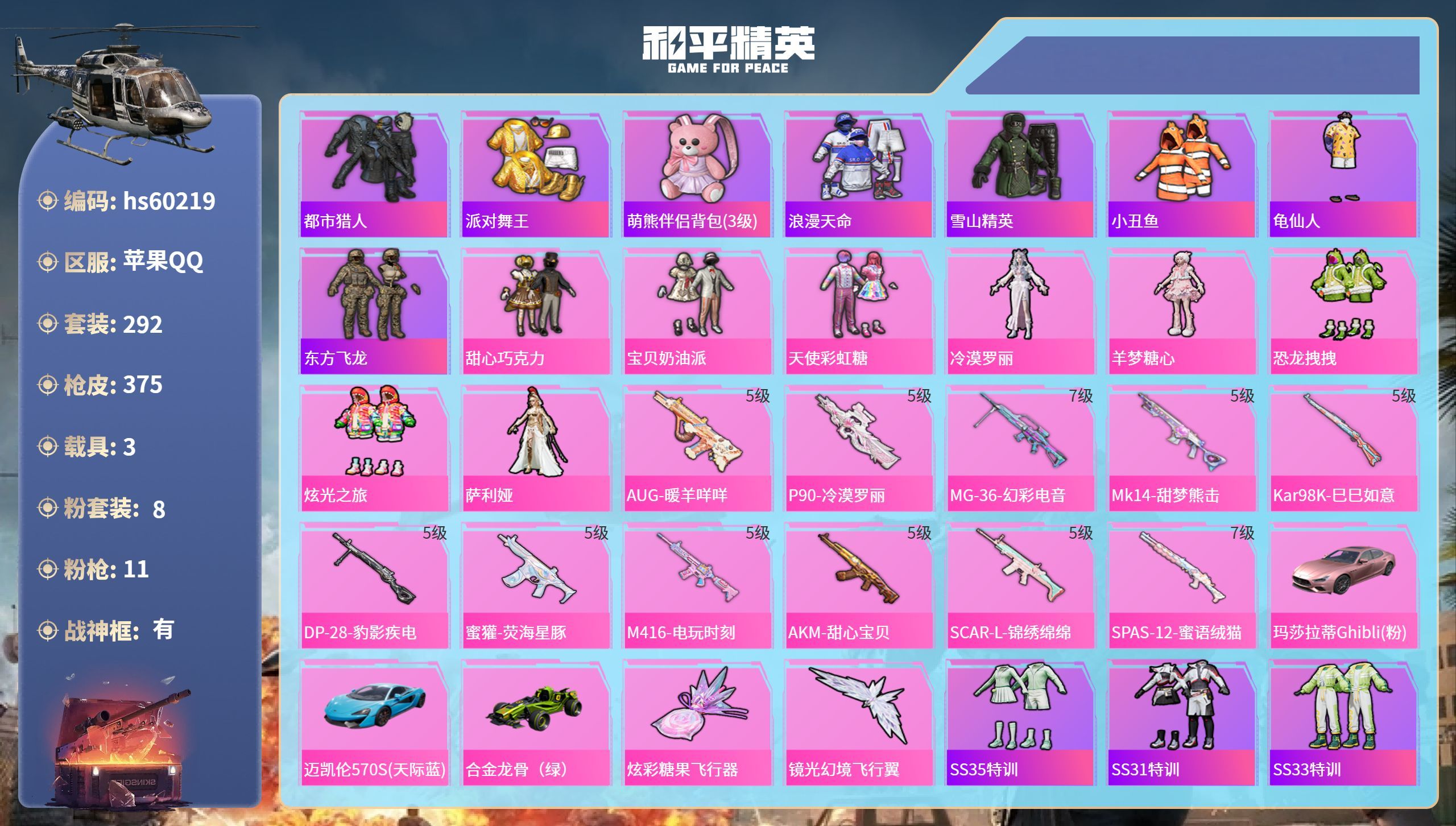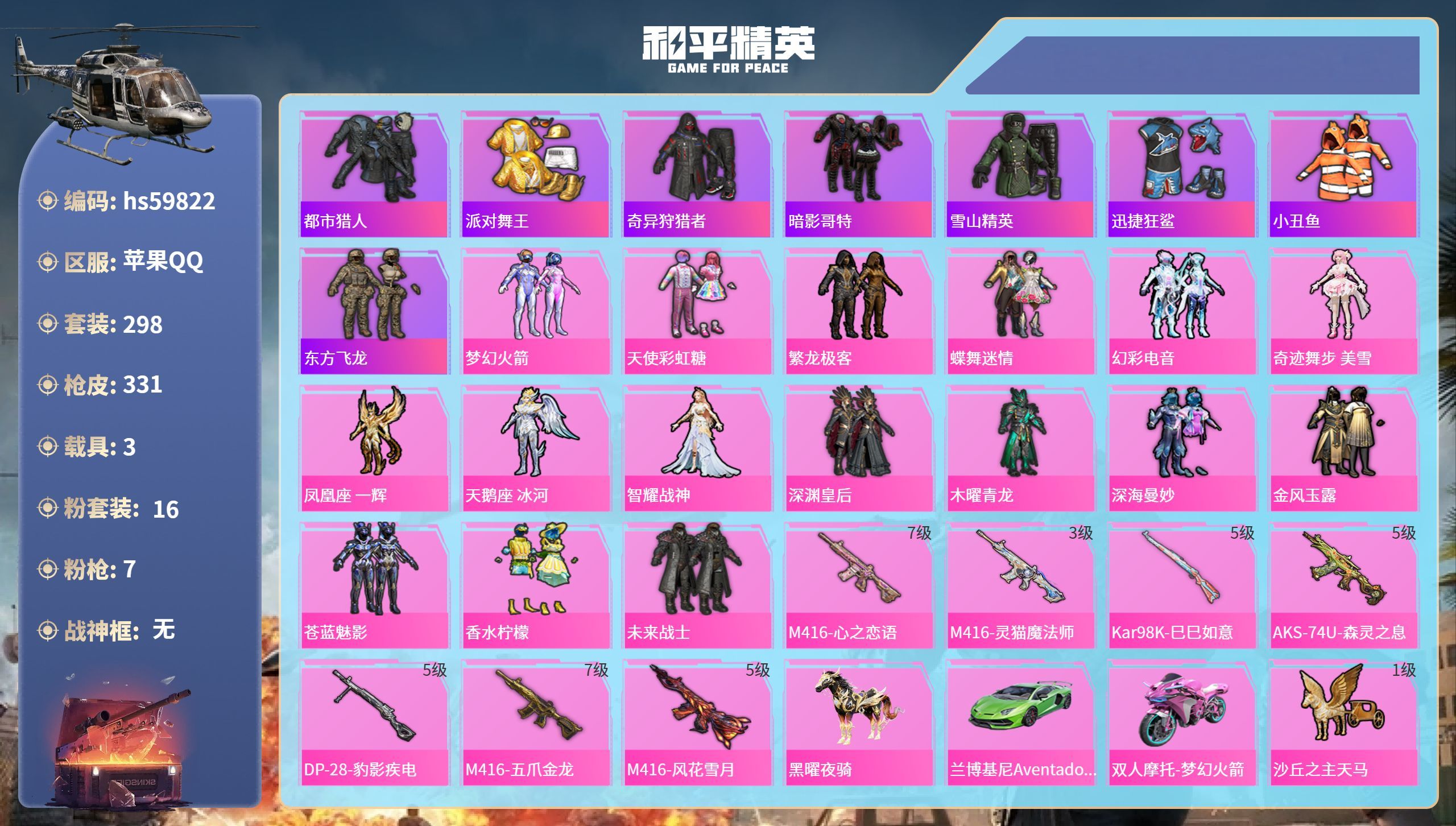 hs59822 苹果手Q-12王牌印记-16粉装-7特效枪-3载具-116720热力值-298套装-