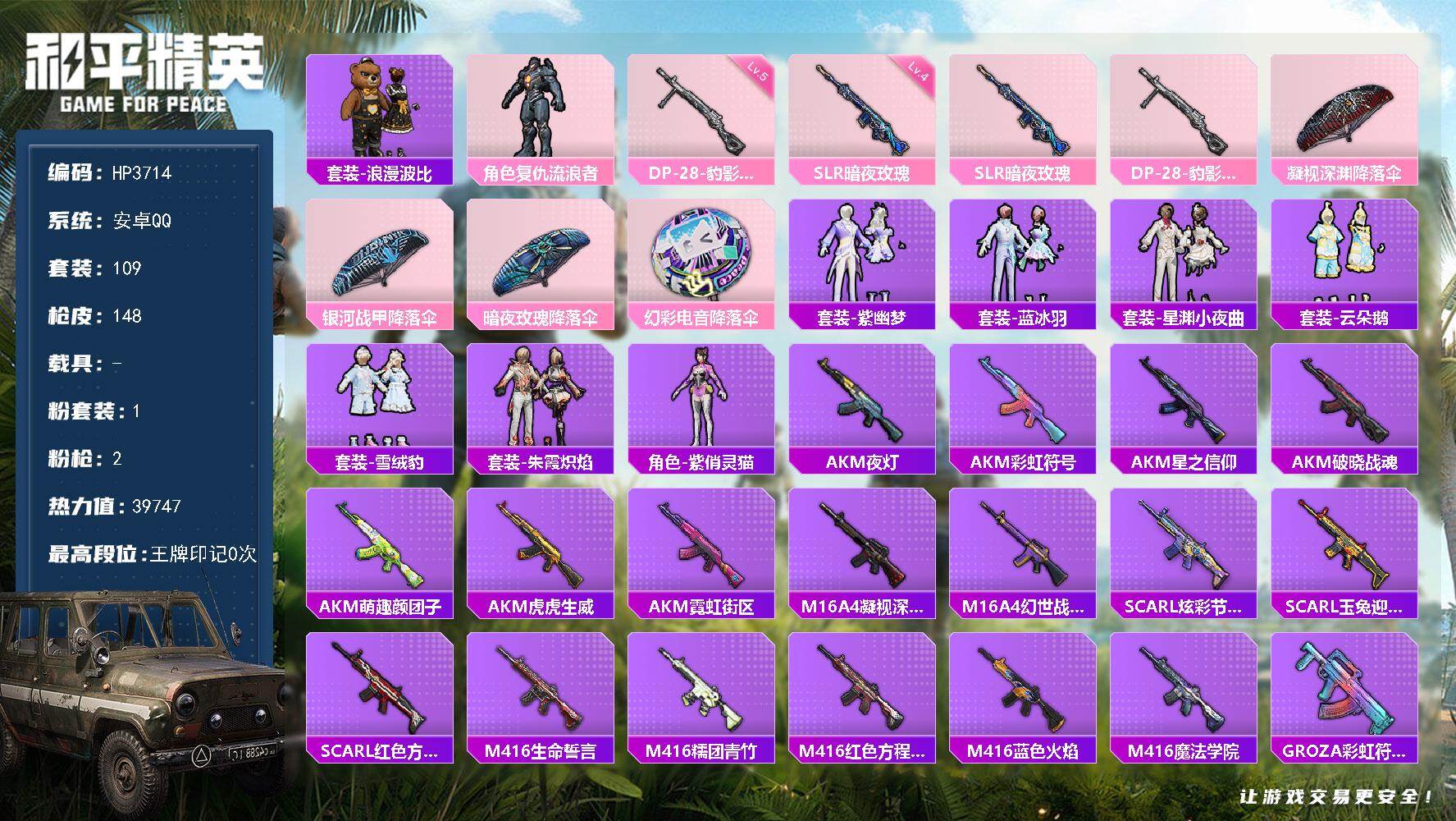 a4272/安卓QQ/9王牌印记-16粉装-5特效枪-2载具-65406热力值-139套装-174枪
