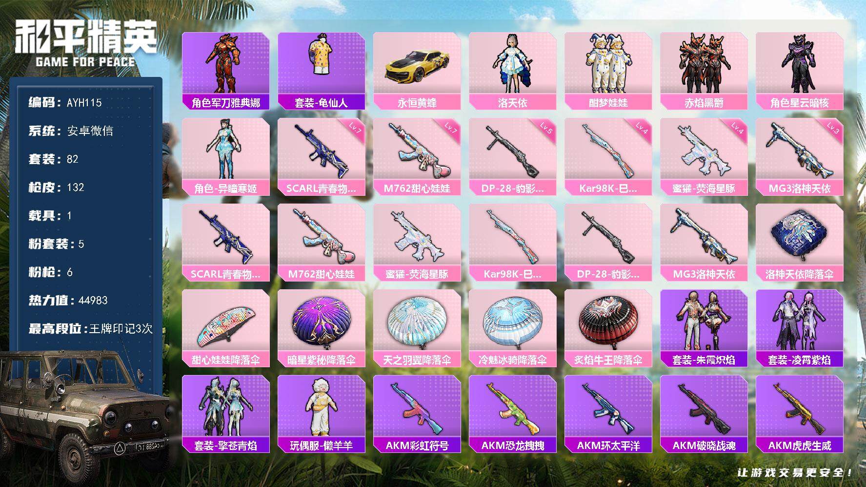安卓QQ-无二次包人脸-9王牌印记-9粉装-5红装-20特效枪-8载具-110644热力值-战备72