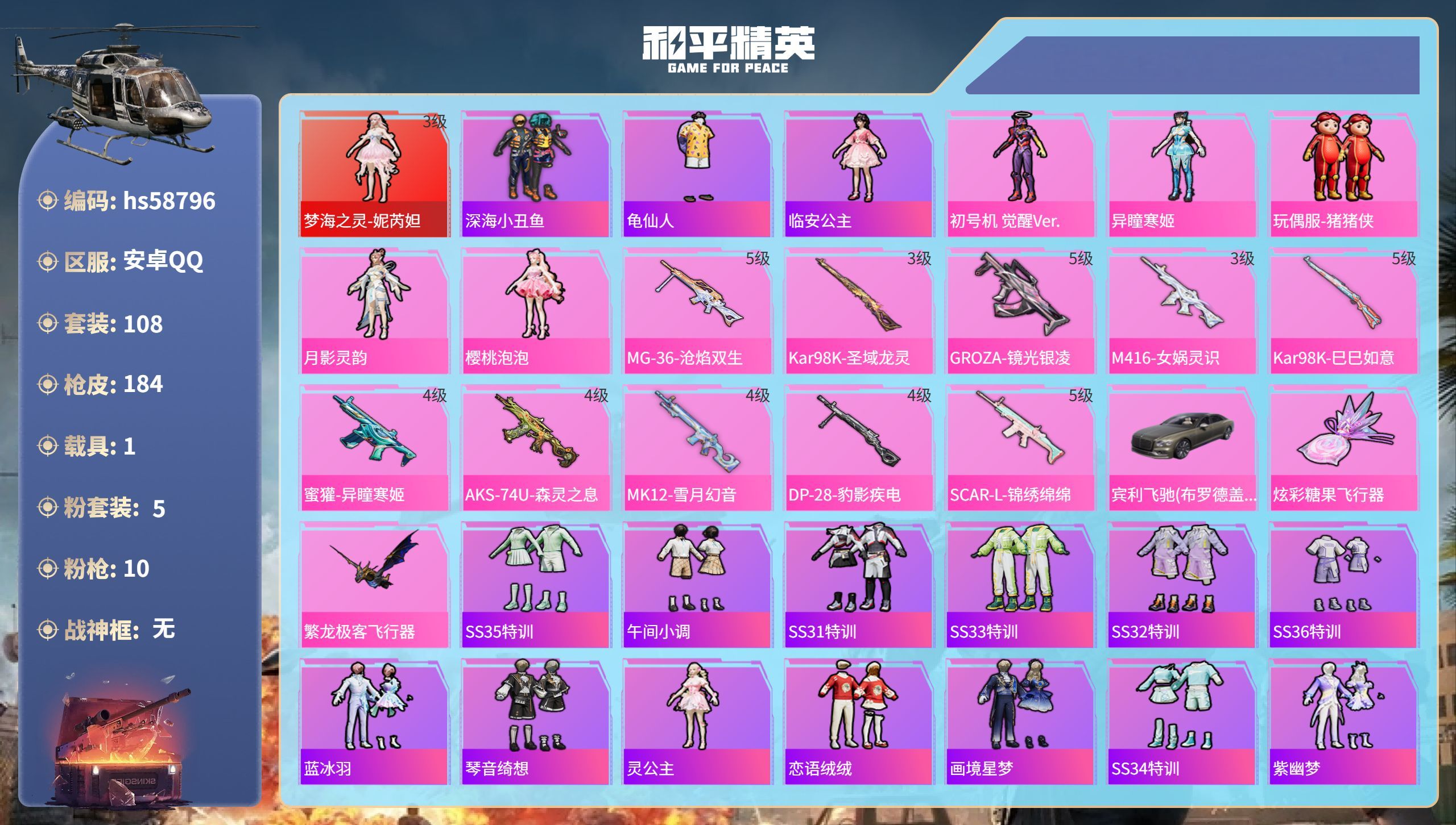hs58721 安卓手Q-10王牌印记-6粉装-8特效枪-1载具-87595热力值-213套装-26