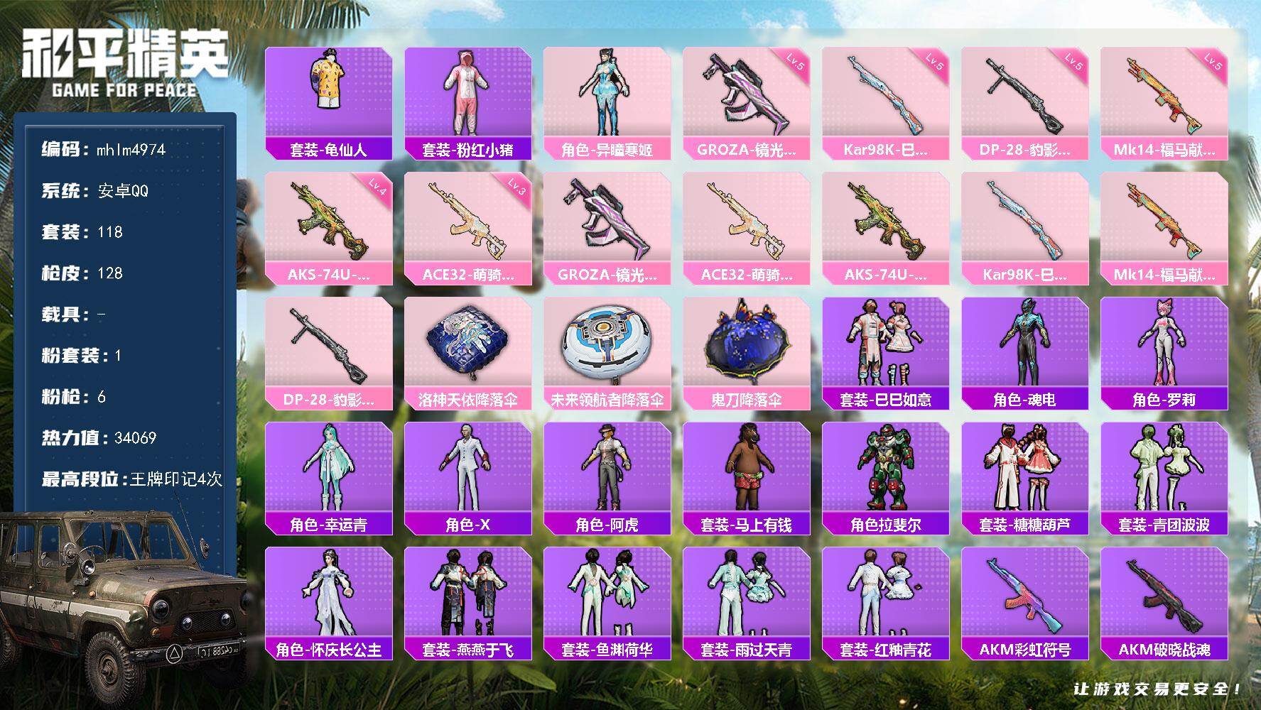 【mhlm4974】安卓 手Q-1粉装-6特效枪-0载具-0粉色飞行器-340