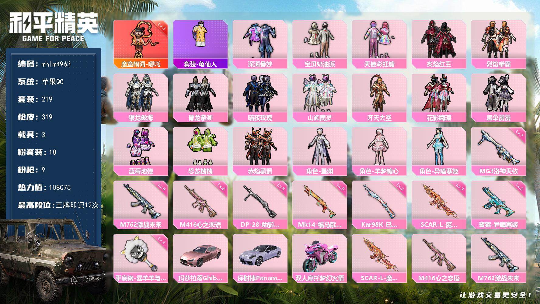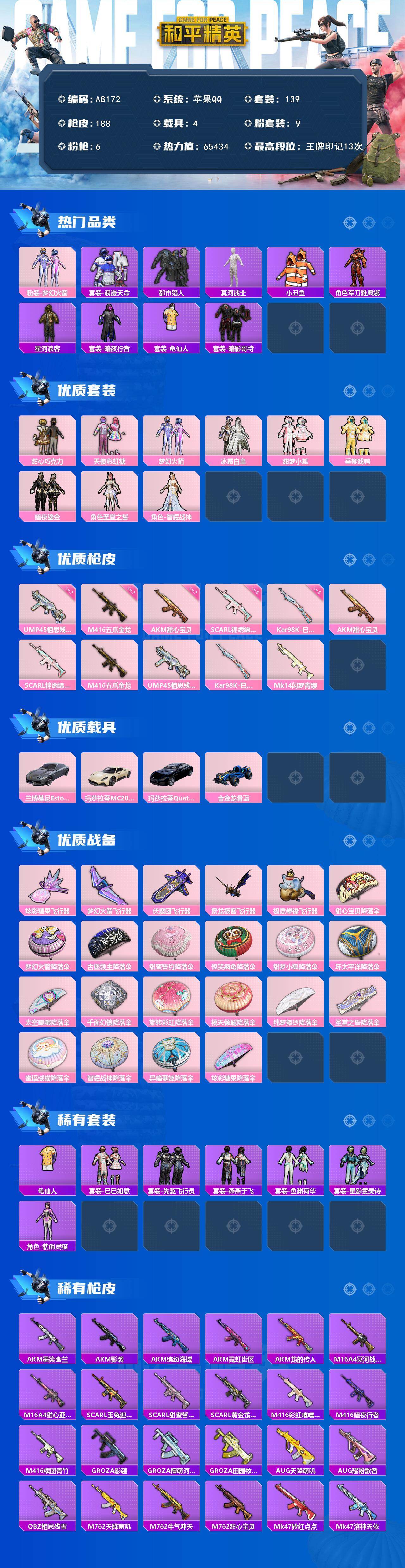 【mhlm4963】苹果 手Q-1神装-18粉装-9特效枪-3载具-7粉色飞行