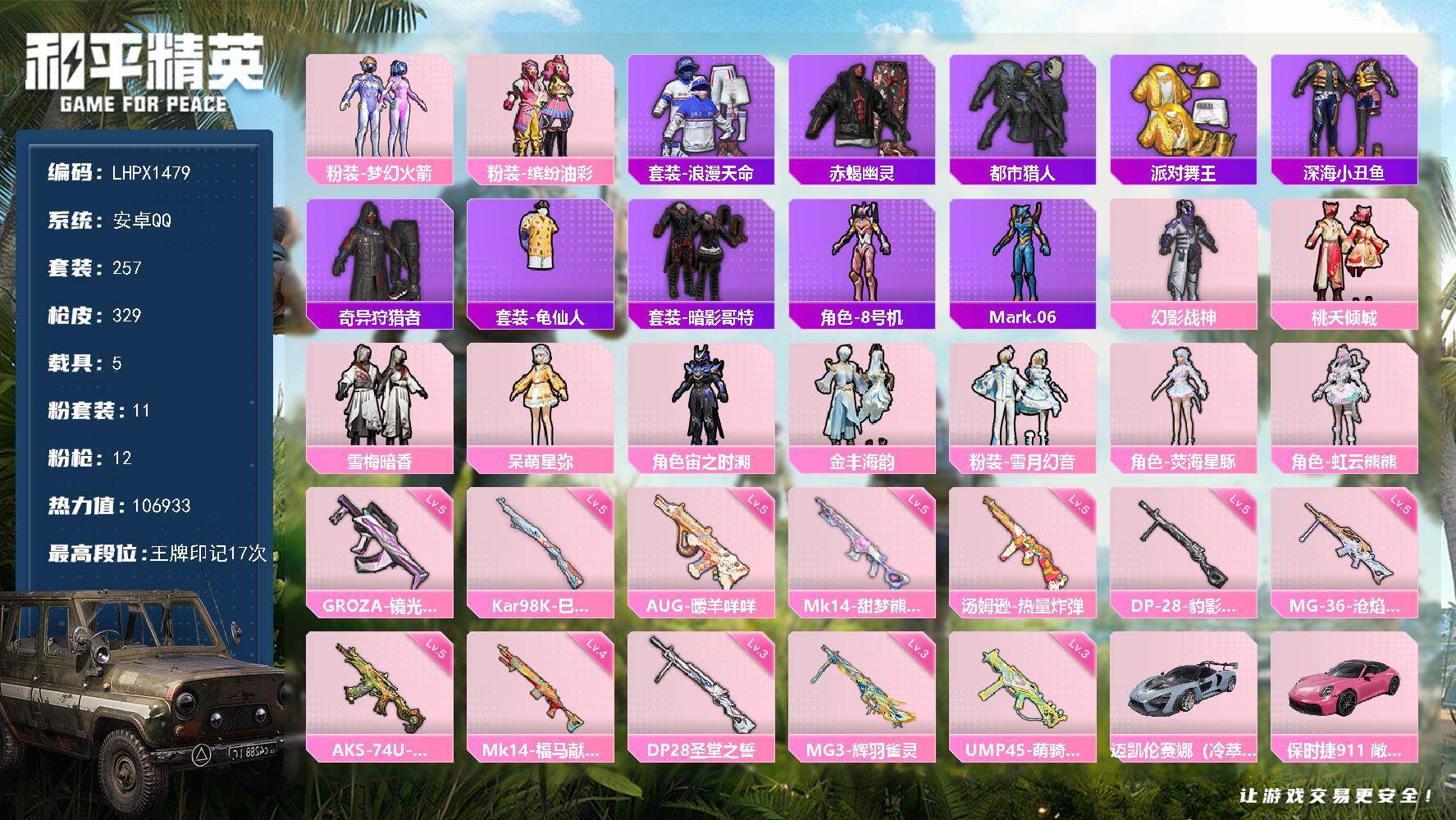 11粉装-12特效枪-5载具-11粉色飞行器-106933热力值-17王牌印记-257套装-329枪皮