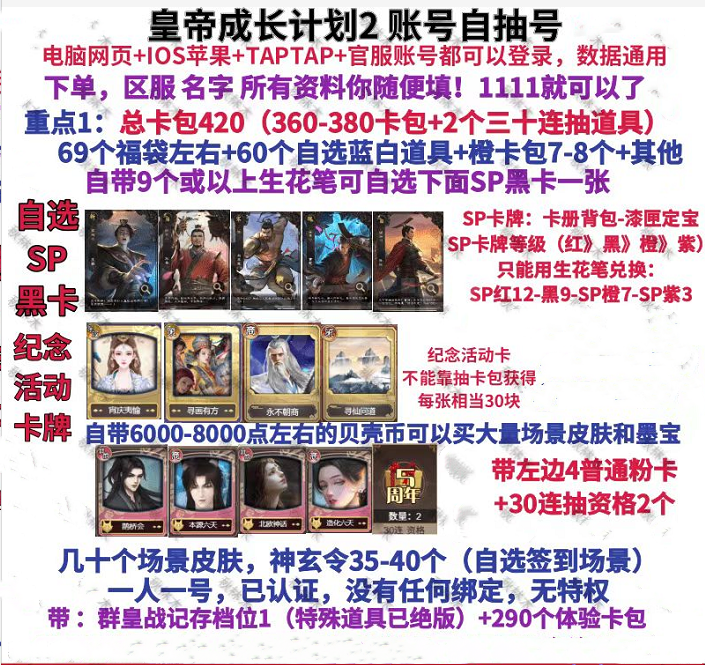 苹果安卓电脑4399手游♦其中有:皇帝165到188卡包账号+30连抽♦