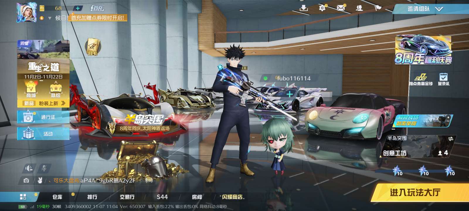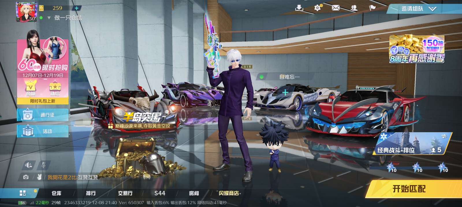 荒野行动pc电脑端手机端V8号,五条悟语音淘汰音效衣服,满级抢多,皮肤多