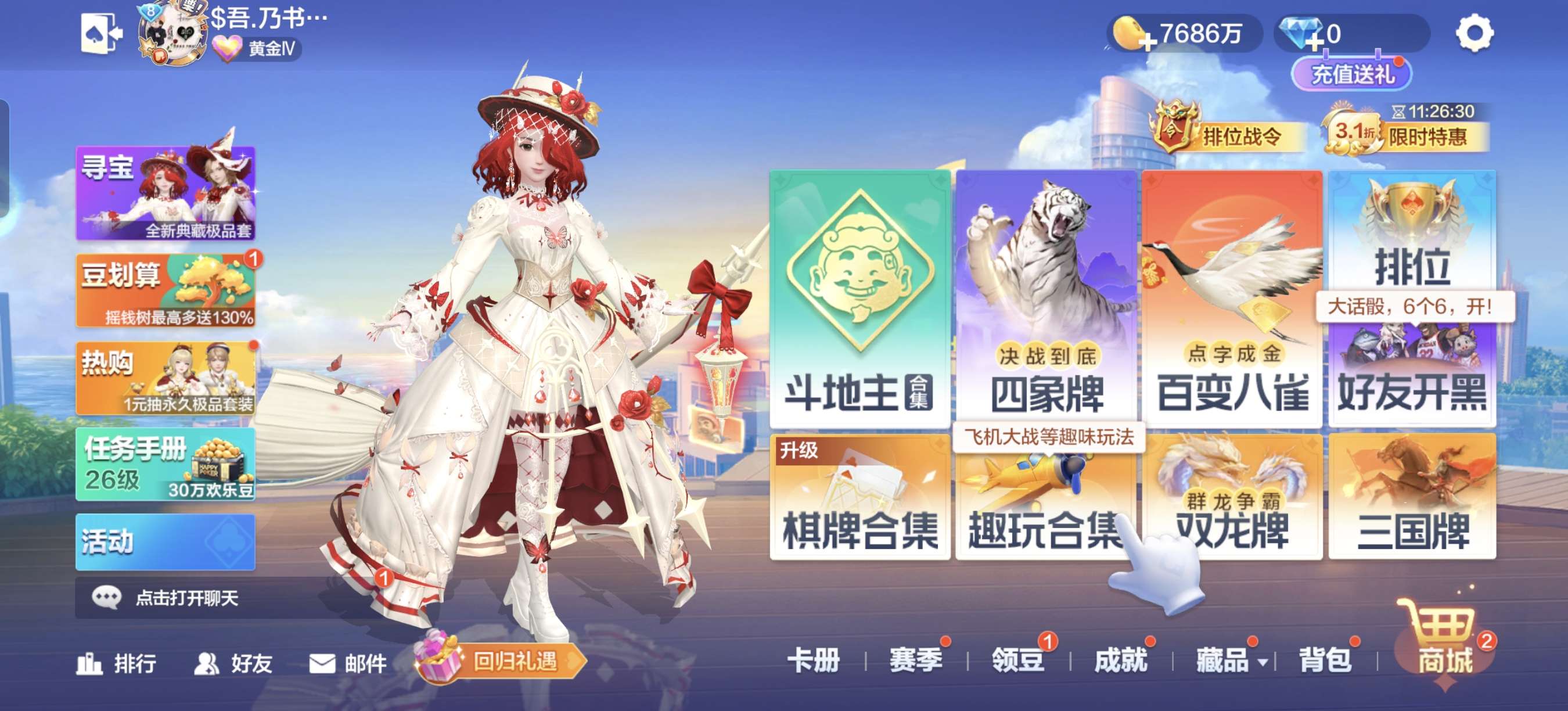 纯手打1.3亿欢乐豆小号,无违规,任何模式可玩,可换绑