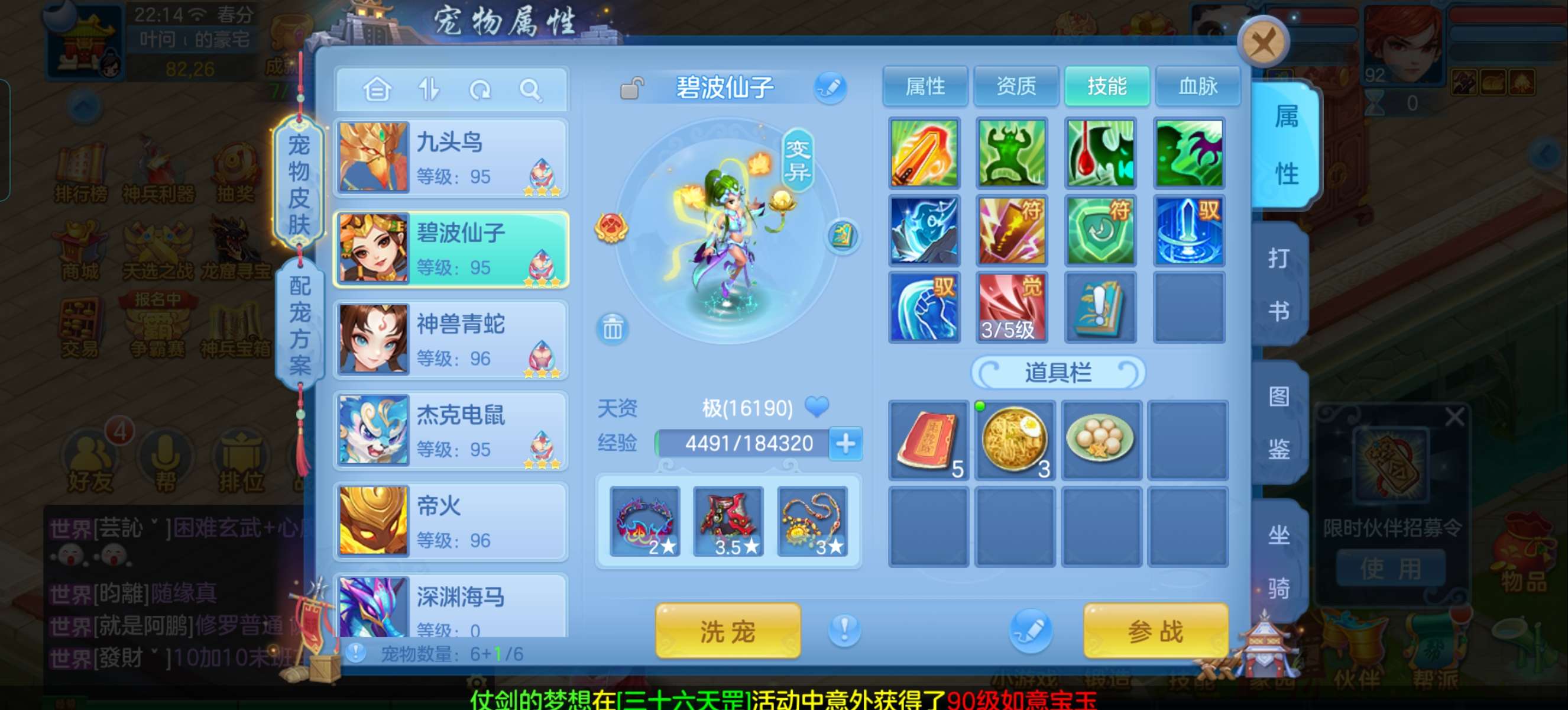 4蛇1龙马1玉龙满内丹带易必武器和易怒腰带,95超级一线天策请看面板,兽魂基本满,宝宝全是极品。