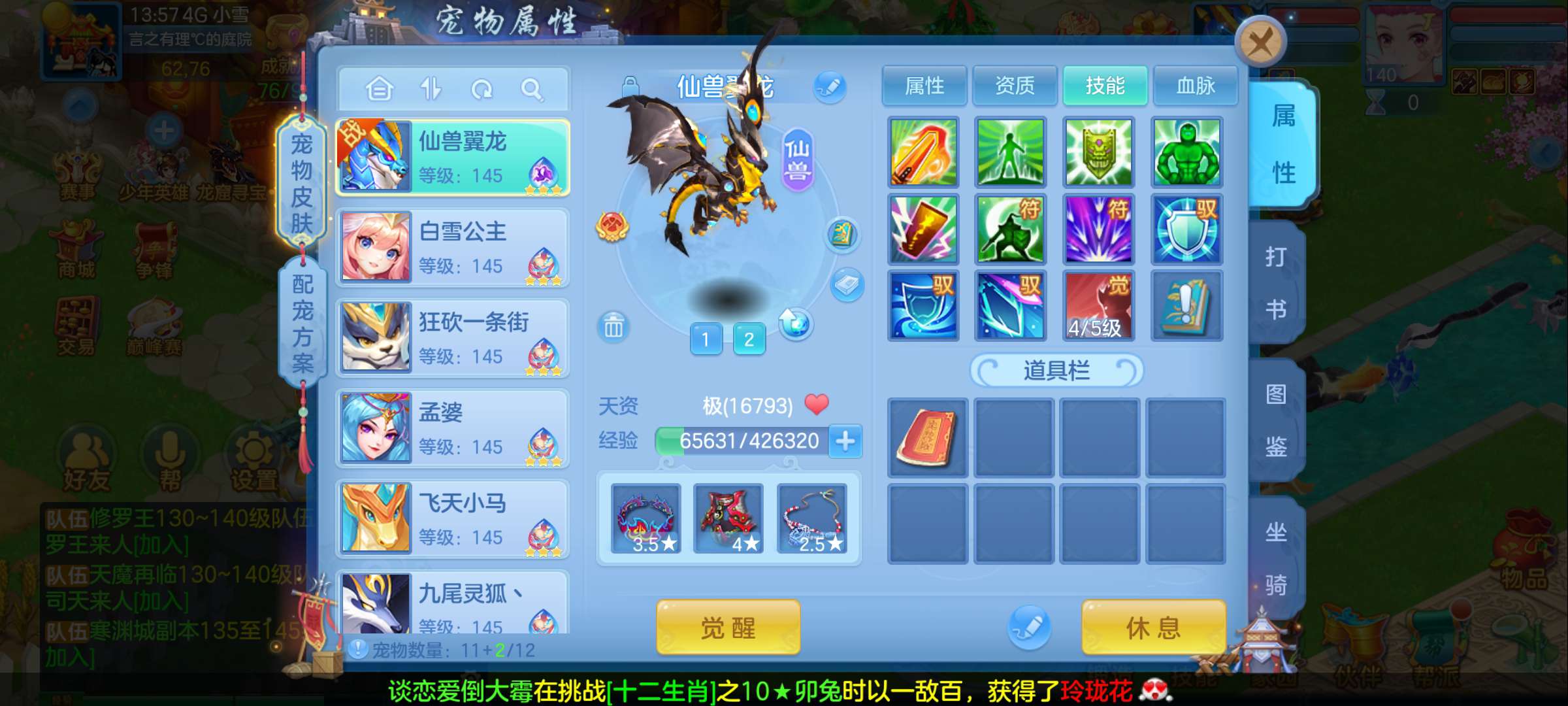 (140龙宫/男)天下无双/邮箱不送/一年换绑★无双重★6件12段,特技装,11个6多特殊5,12红13黄7专属血脉,高级坐骑2染+金拍庄园,仓库还有资源,神兽内丹碎片38,3233成就