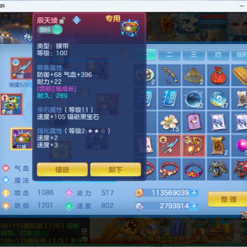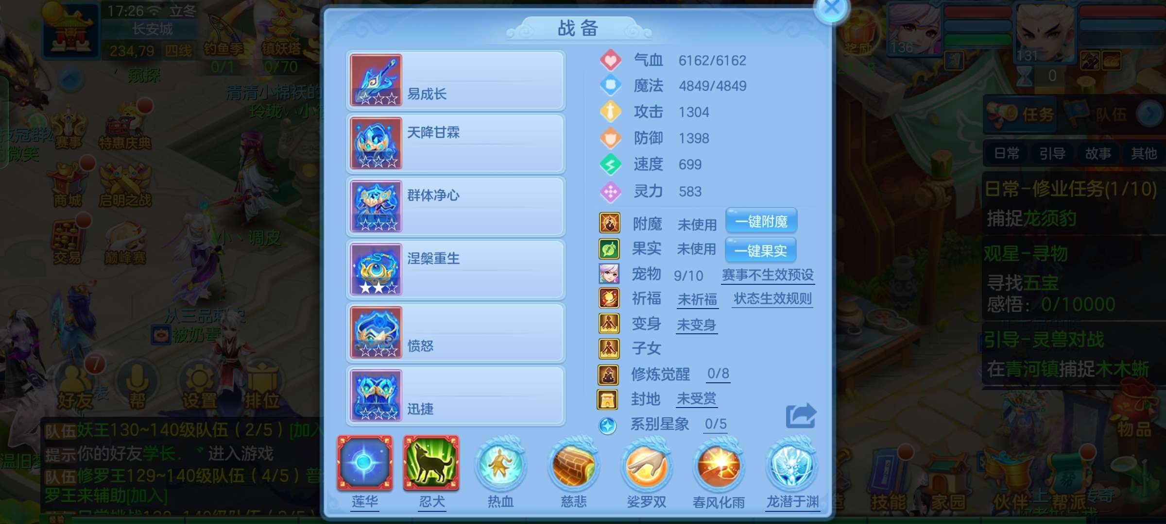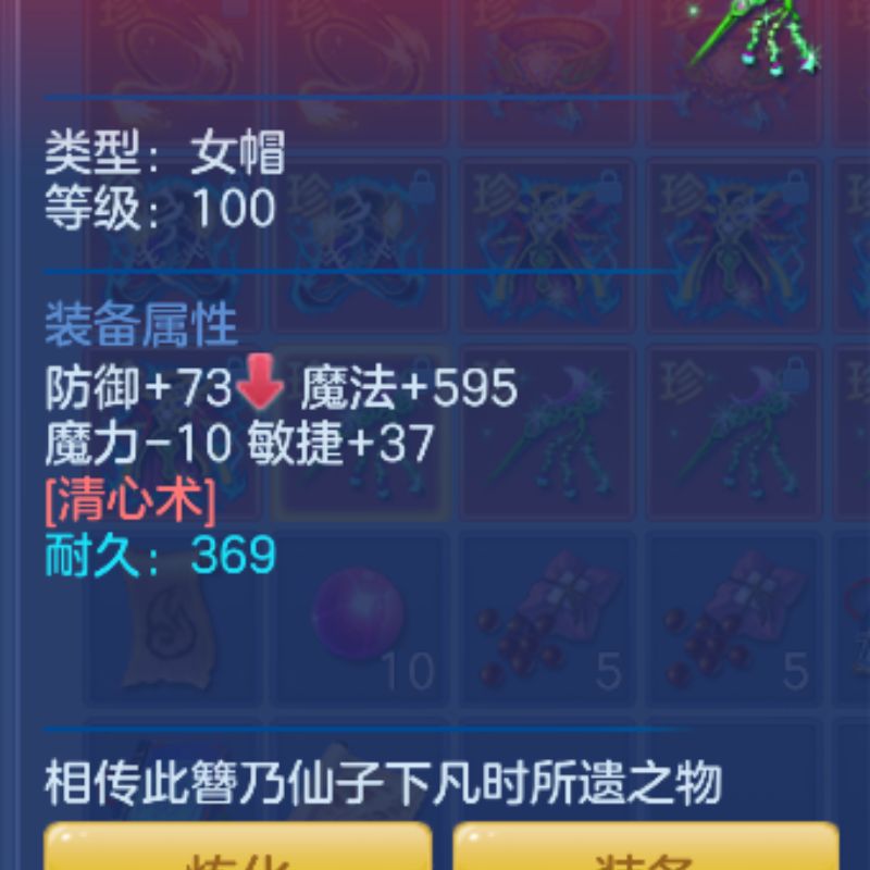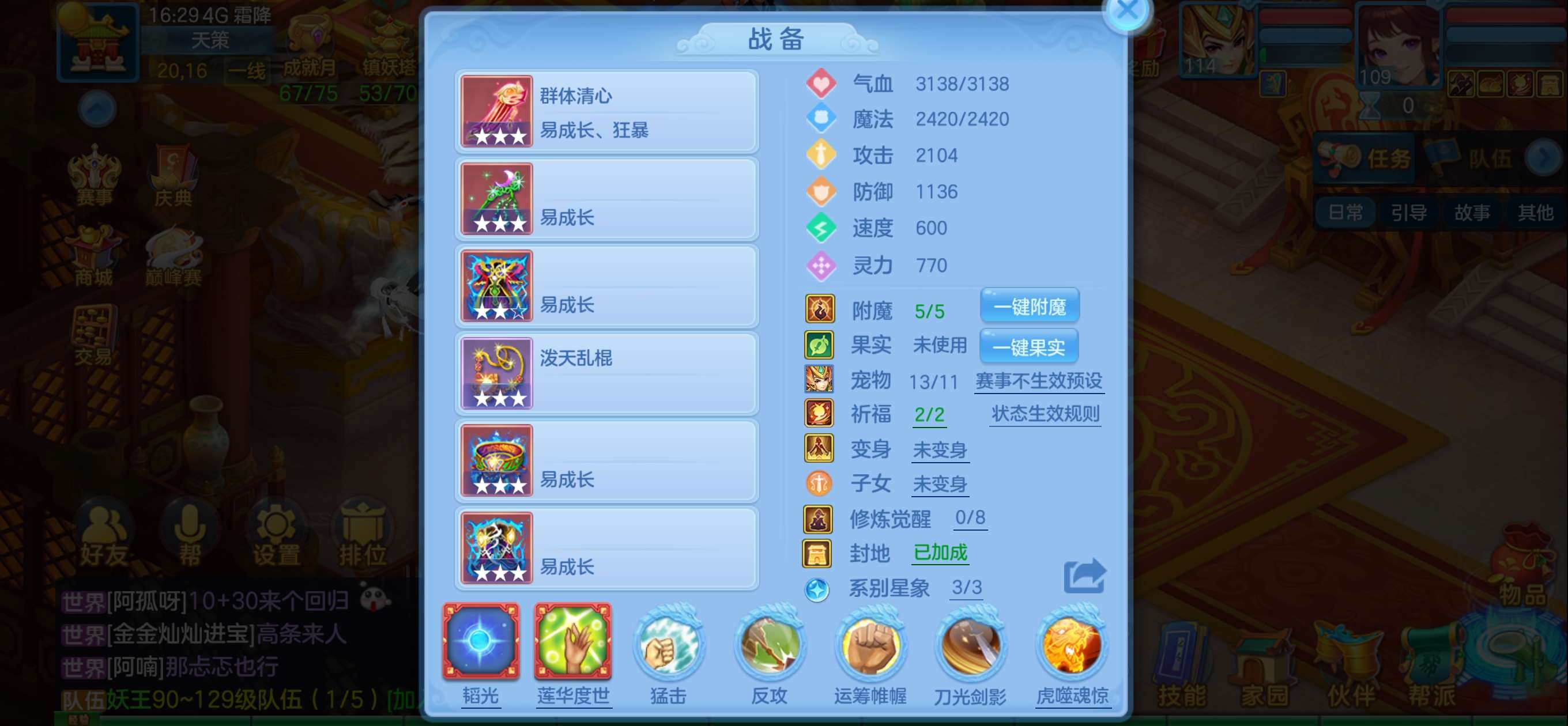 今年勇109女普陀,2仙兽2强化,13段,可转法封,激励易成长衣服,愤怒易成长腰带,疾速易成长帽子,笑里易成长项链。2只内丹强化神,迅捷慈航鞋子,26只满兽魂宝宝,14个专属天赋,庄园,2980邮箱,无双重