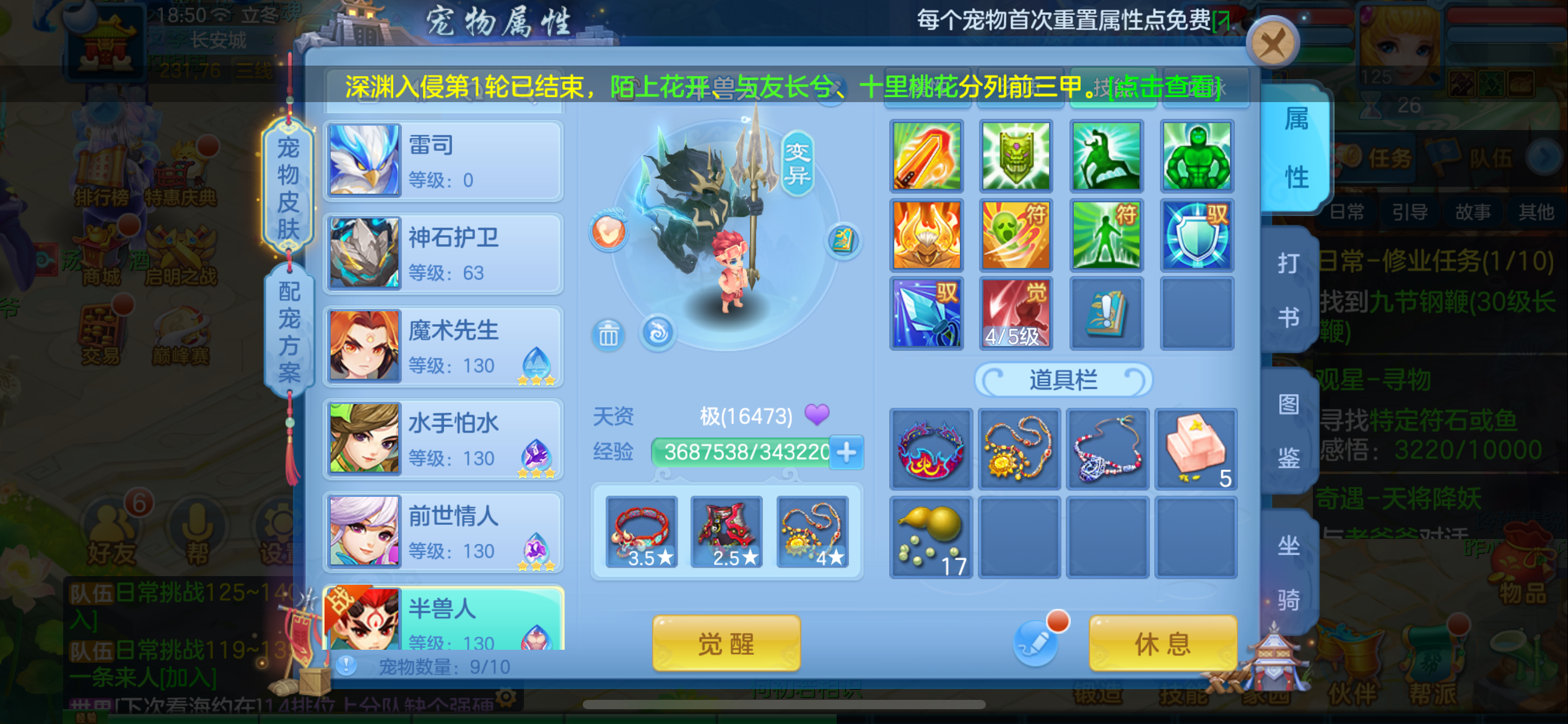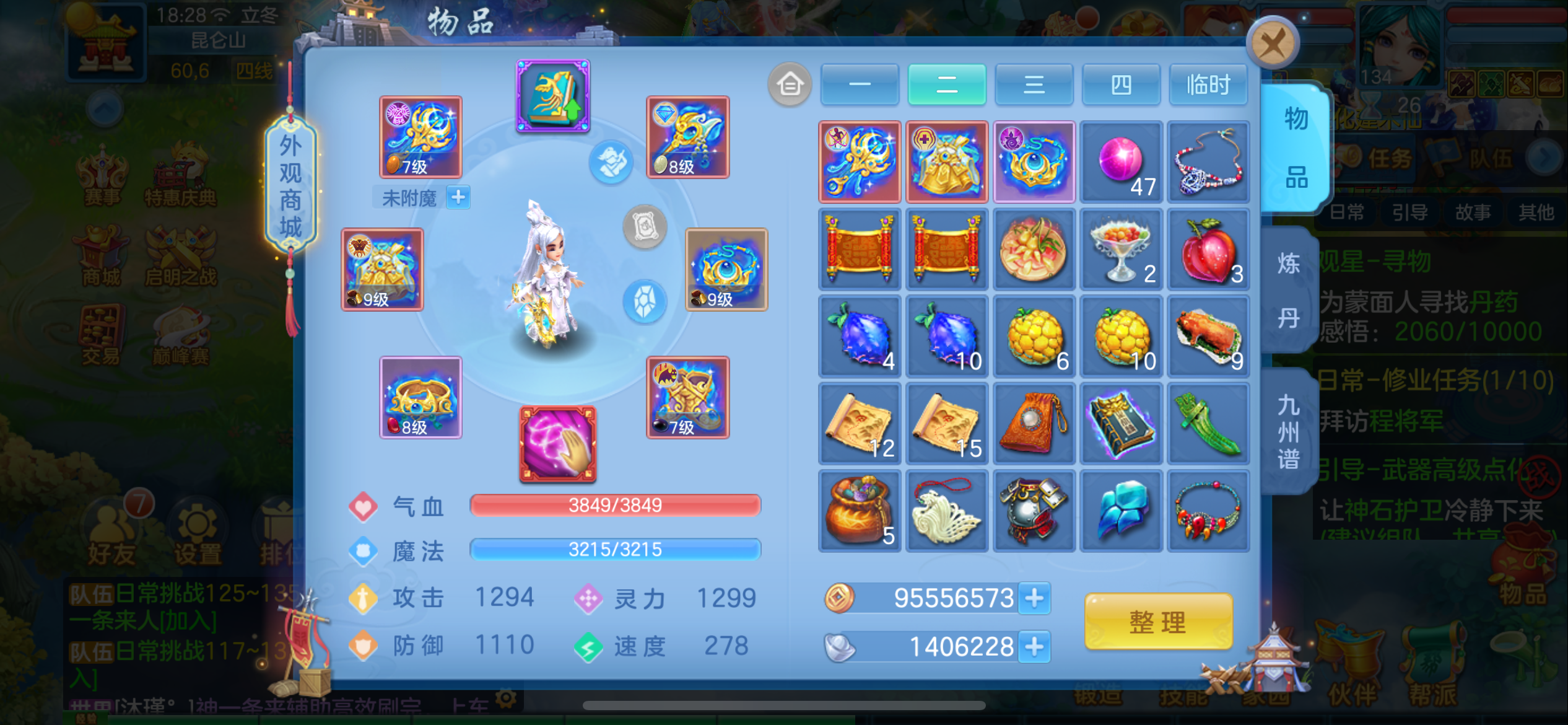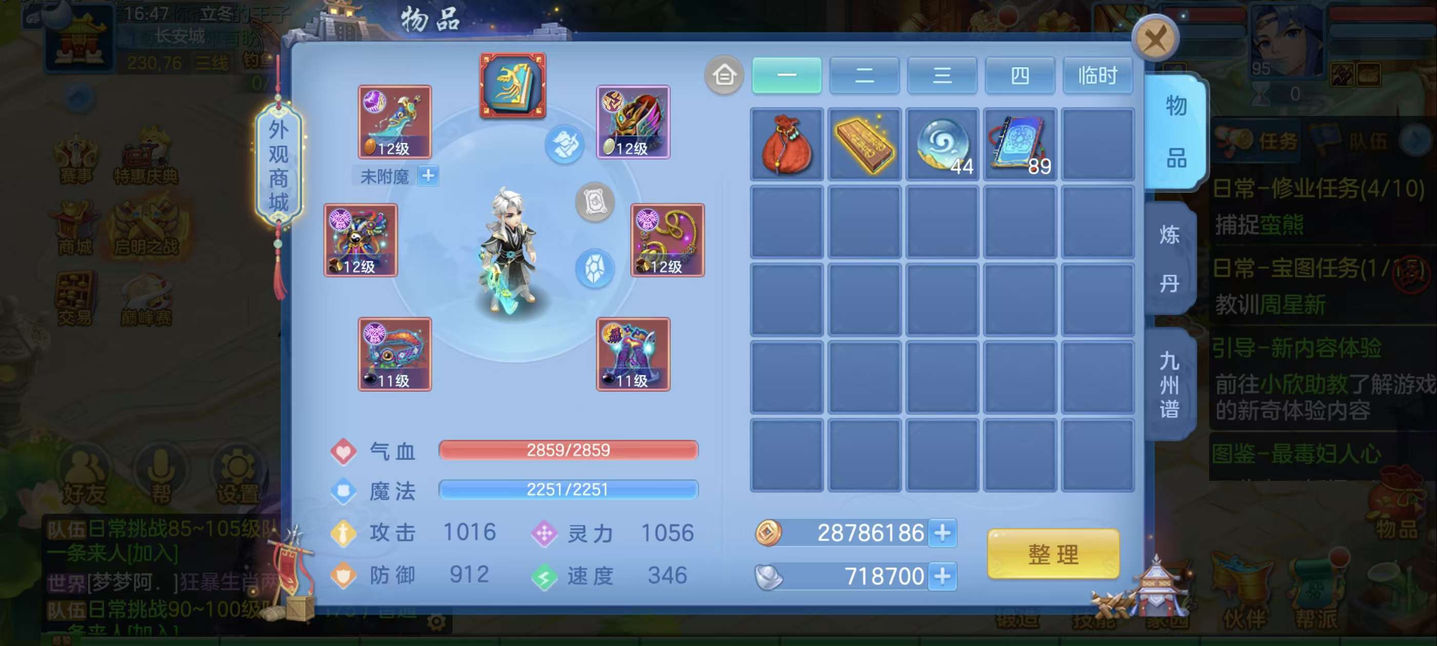今年勇109女普陀,2仙兽2强化,13段,可转法封,激励易成长衣服,愤怒易成长腰带,疾速易成长帽子,笑里易成长项链。2只内丹强化神,迅捷慈航鞋子,26只满兽魂宝宝,14个专属天赋,庄园,2980邮箱,无双重