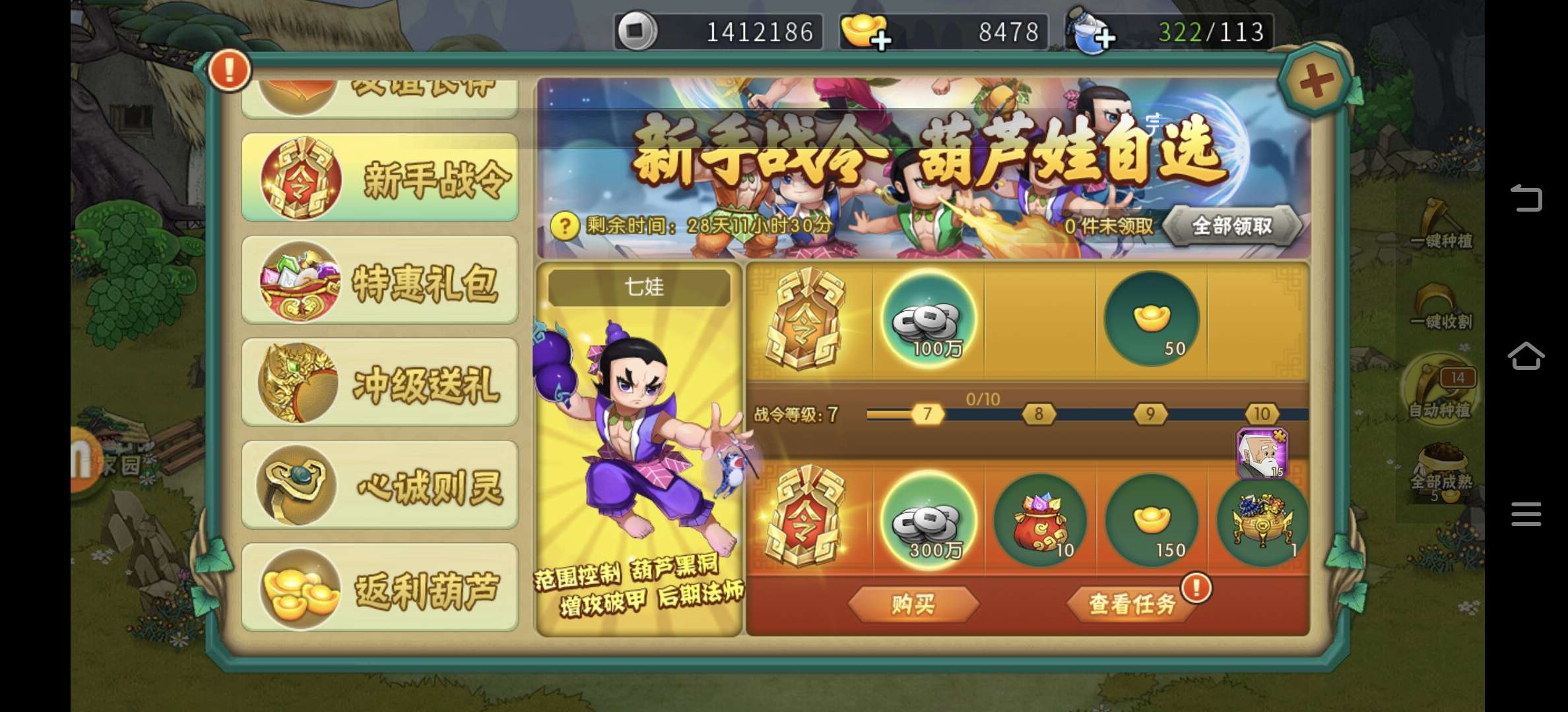 新区开服两天的葫芦娃账号,3月26号注册,游戏币4770,战令、基金这些基本都买了