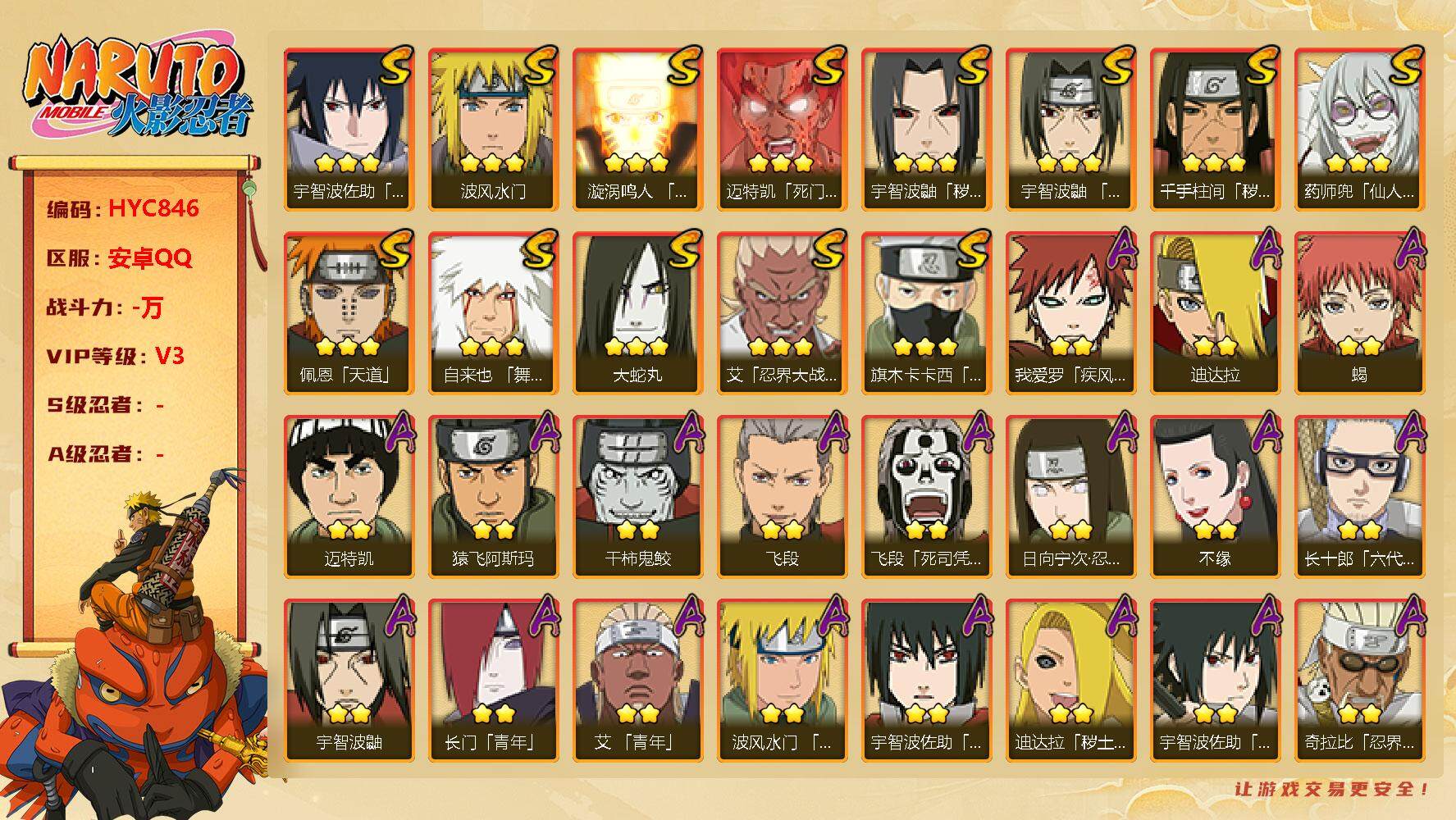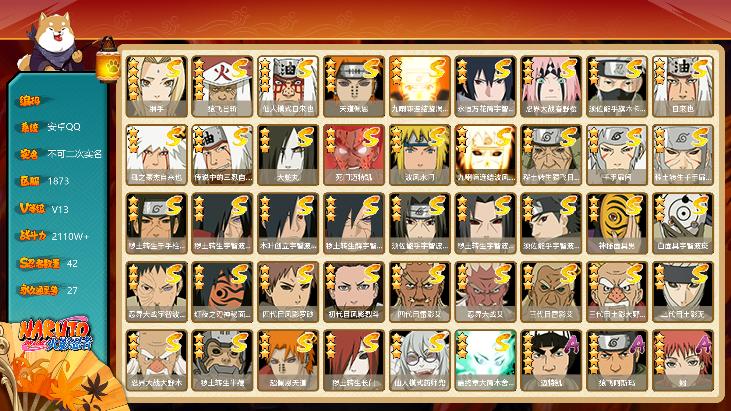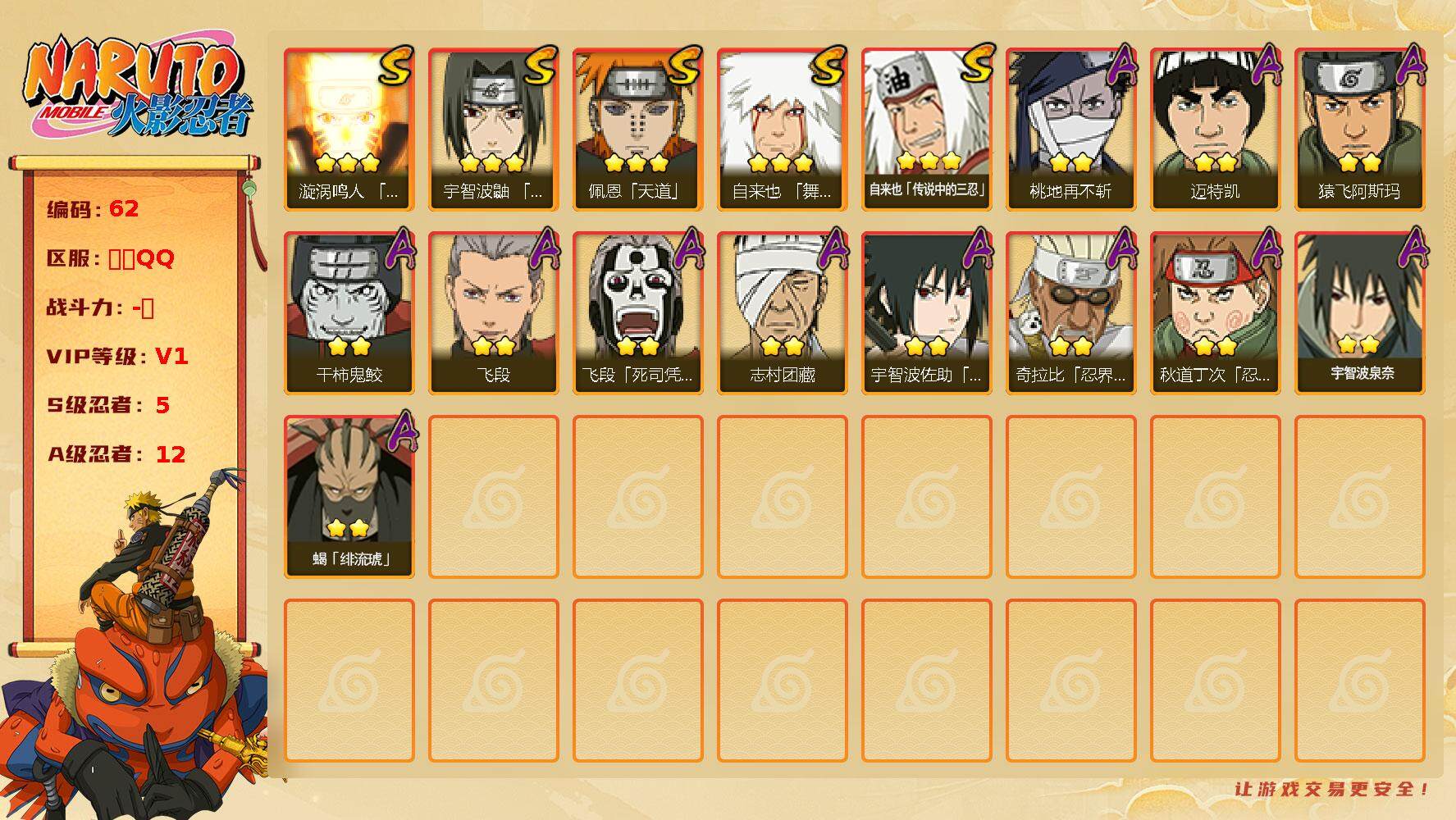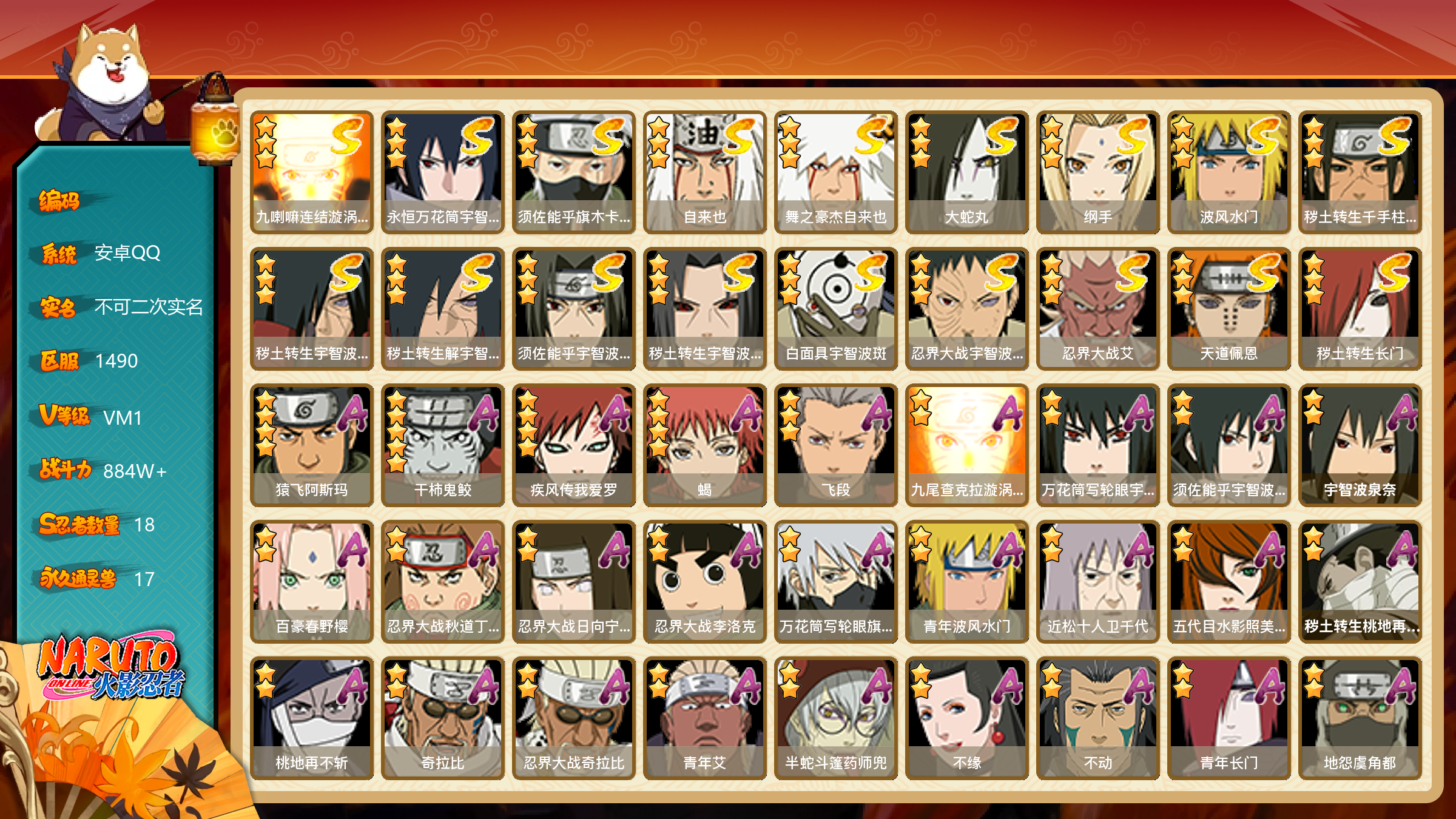 火影忍者【安卓QQ】V11 18S忍 29A忍 165忍 2490S碎片 18通灵 1100W战力 前300名 影级