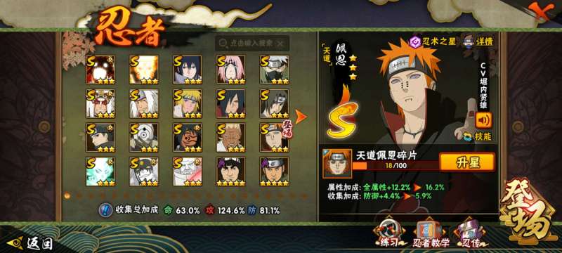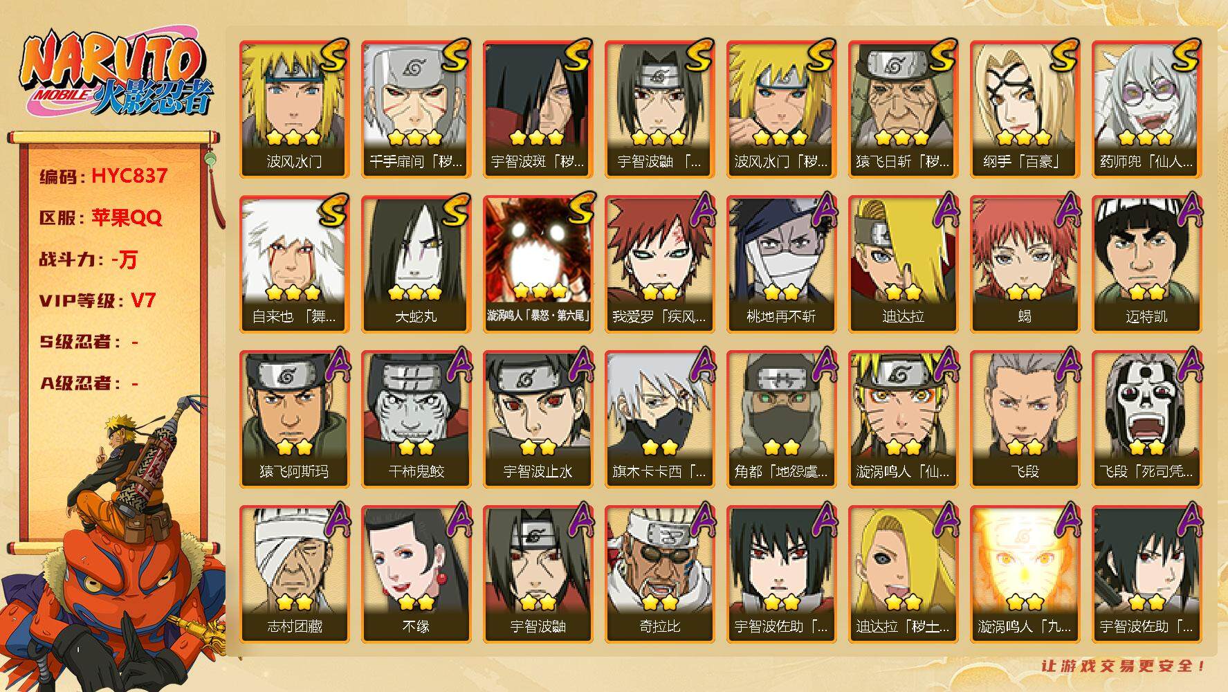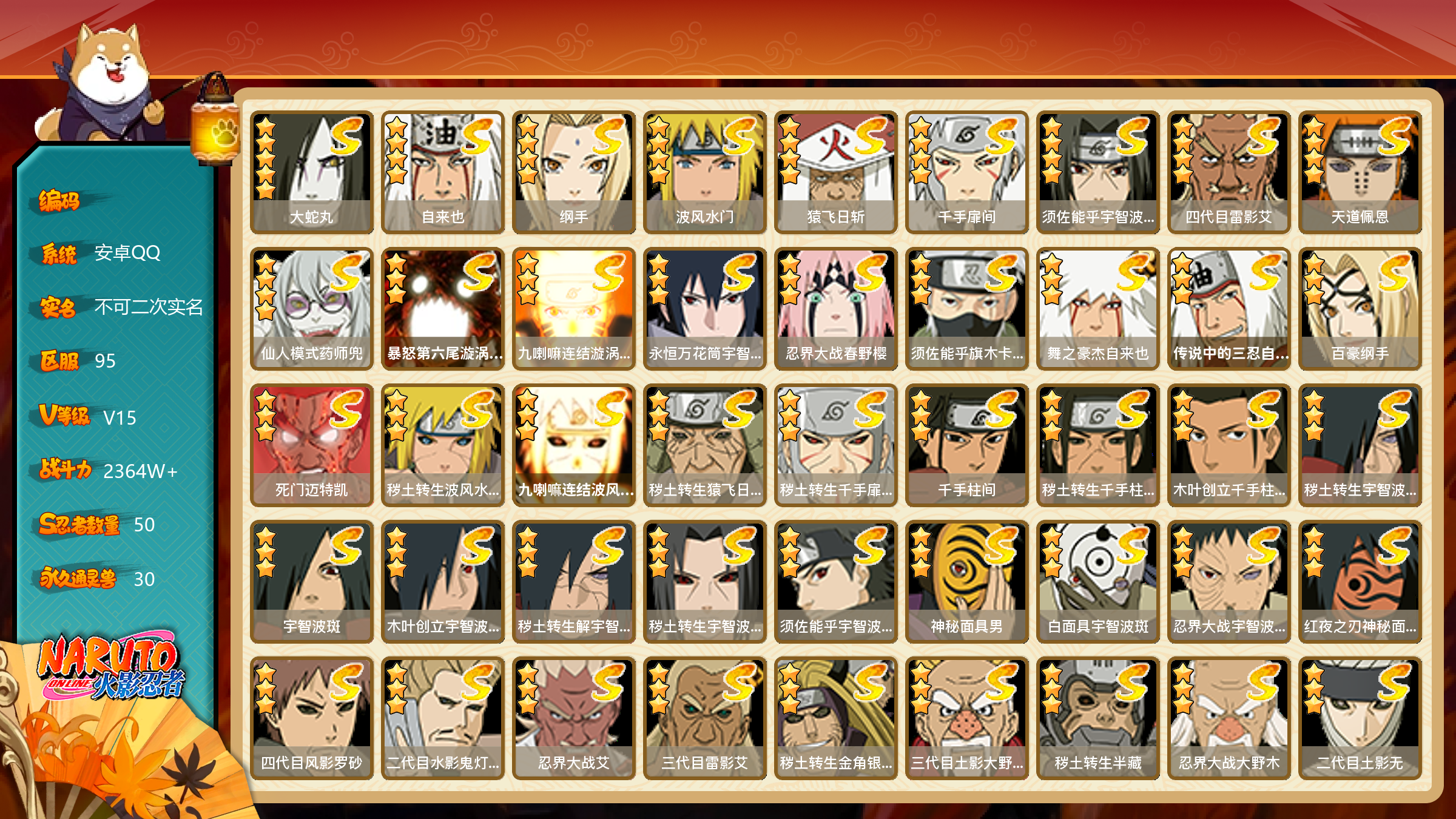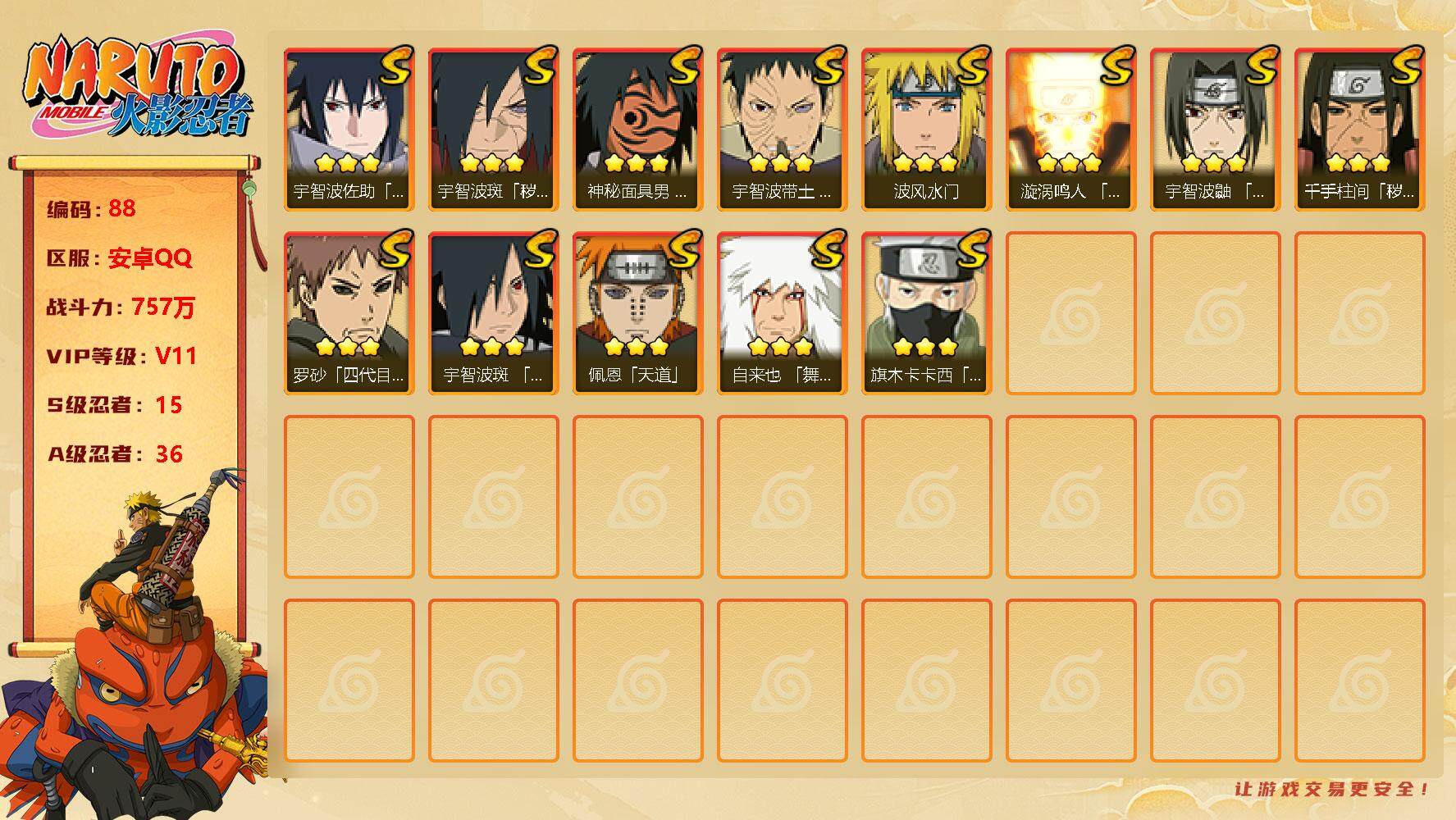 火影忍者【安卓QQ】V11 18S忍 29A忍 165忍 2490S碎片 18通灵 1100W战力 前300名 影级
