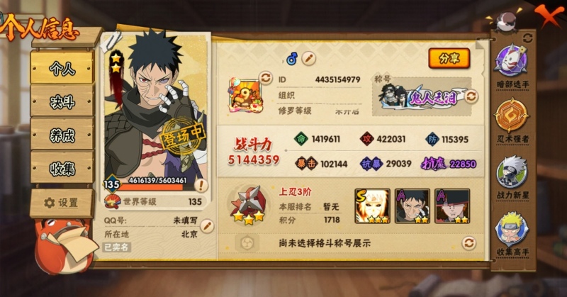 火影忍者【安卓QQ】战斗力:2110W+;段位:中忍3阶;本服排名:38;