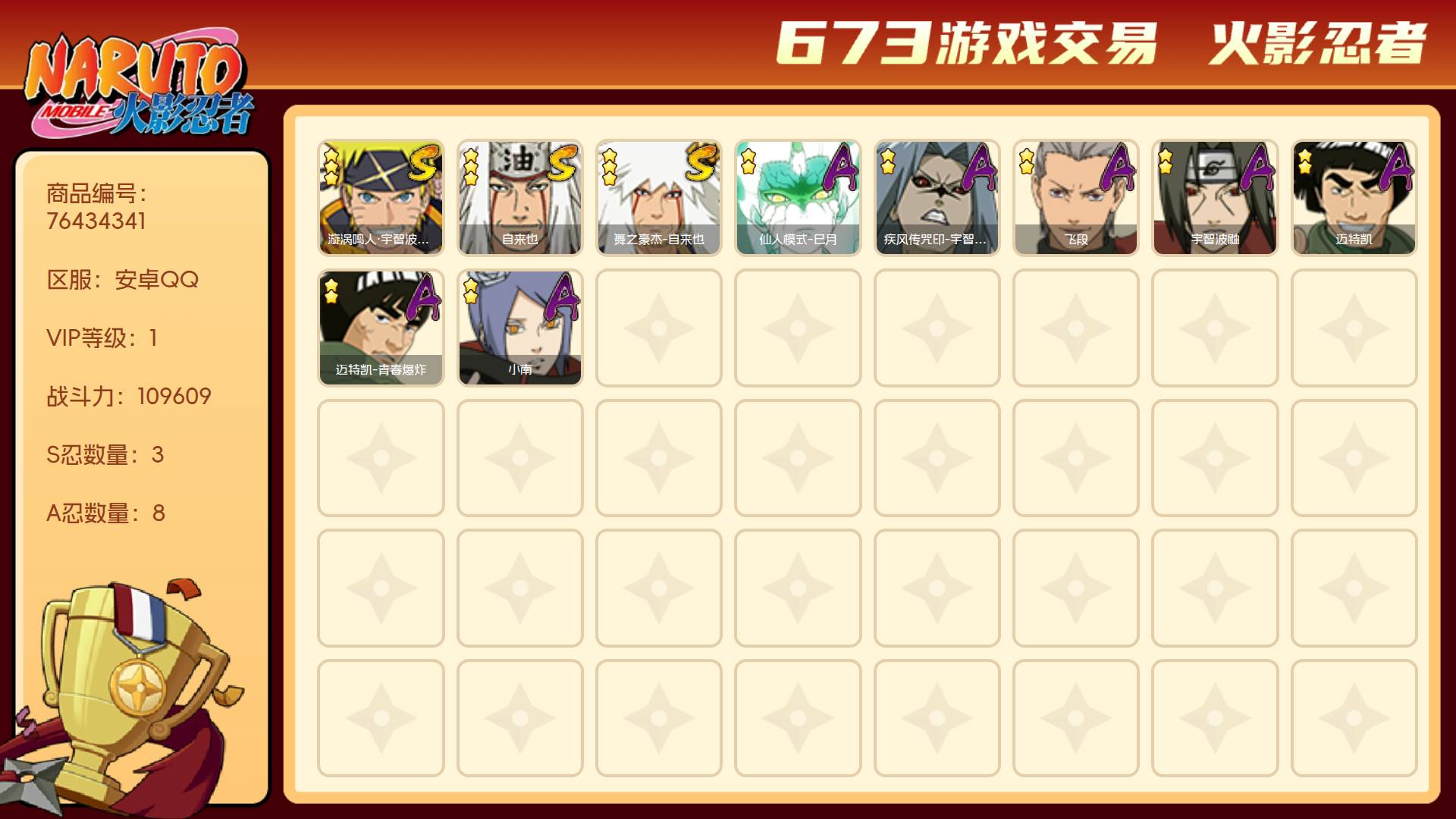 角色等级94 金币1000 战斗力109609 S忍3 A忍8 1 段位超影
