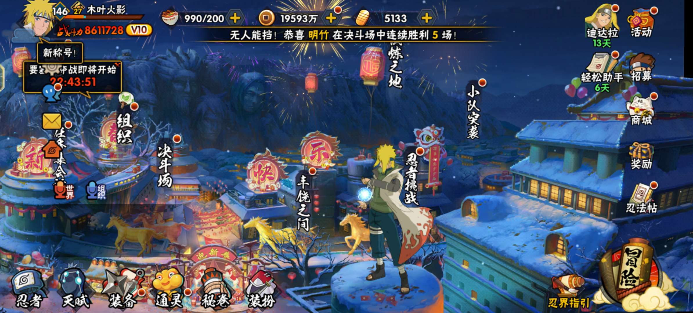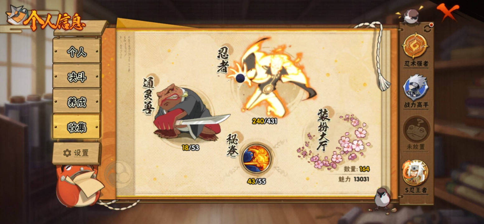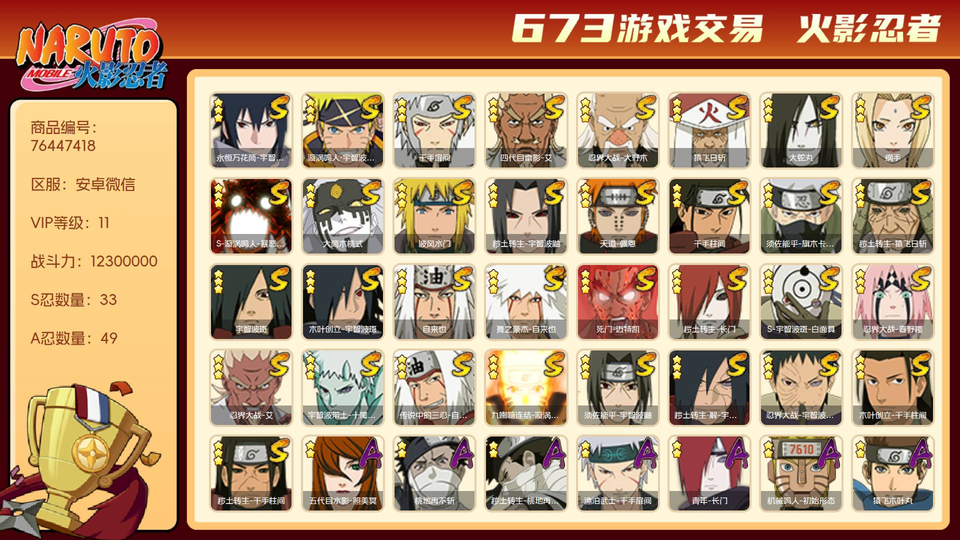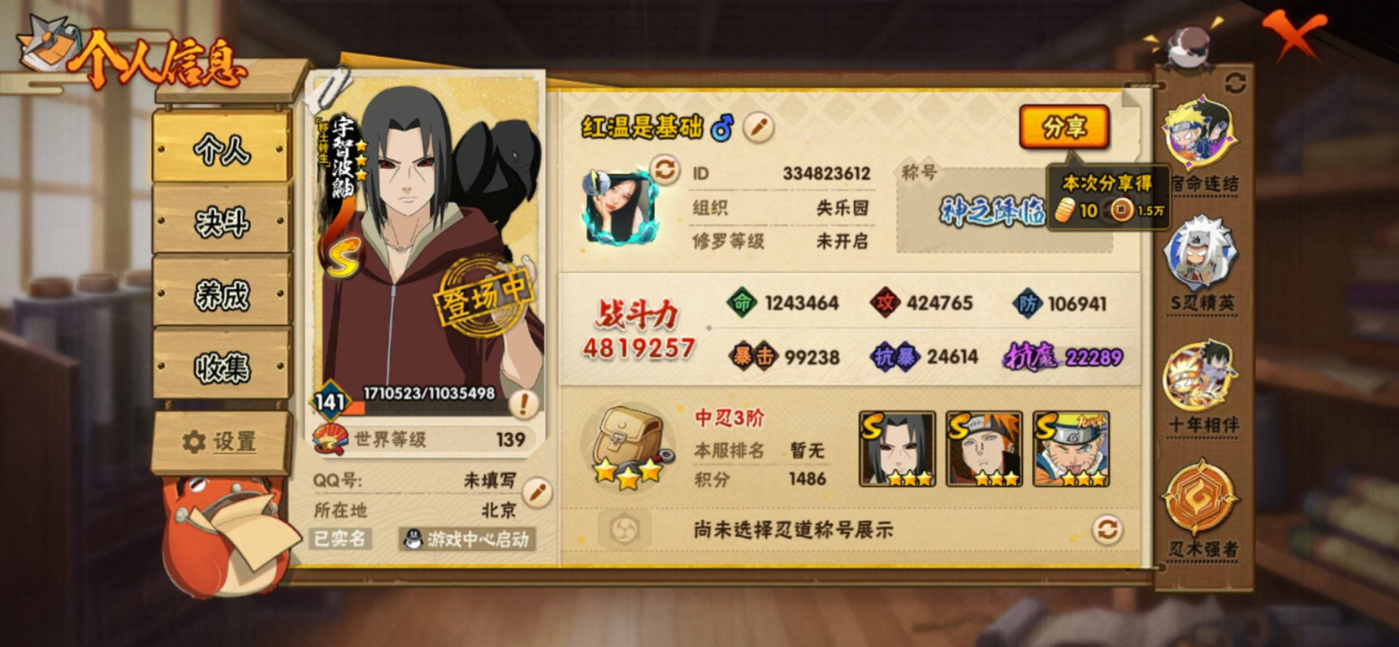 金币3888 战斗力12300000 S忍33 A忍49 11 段位上忍