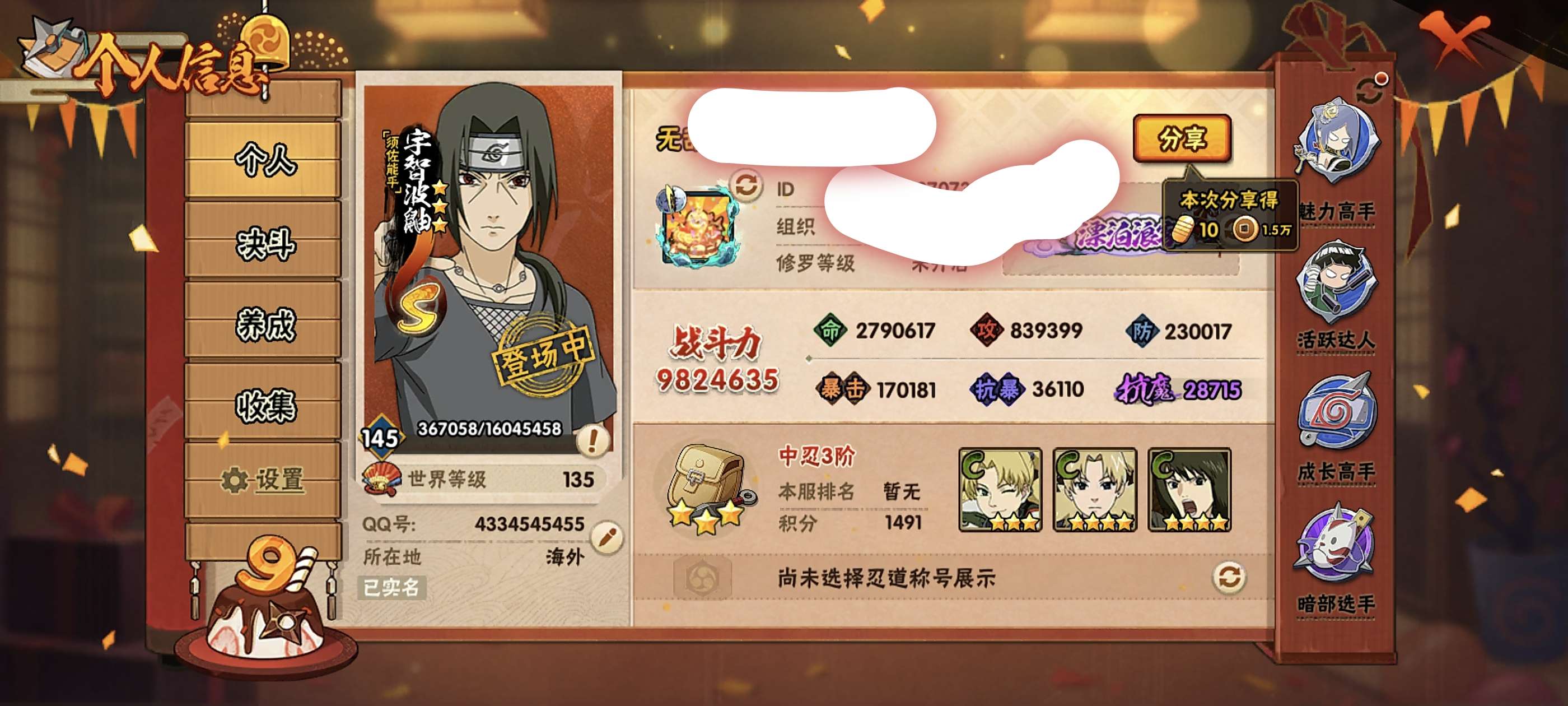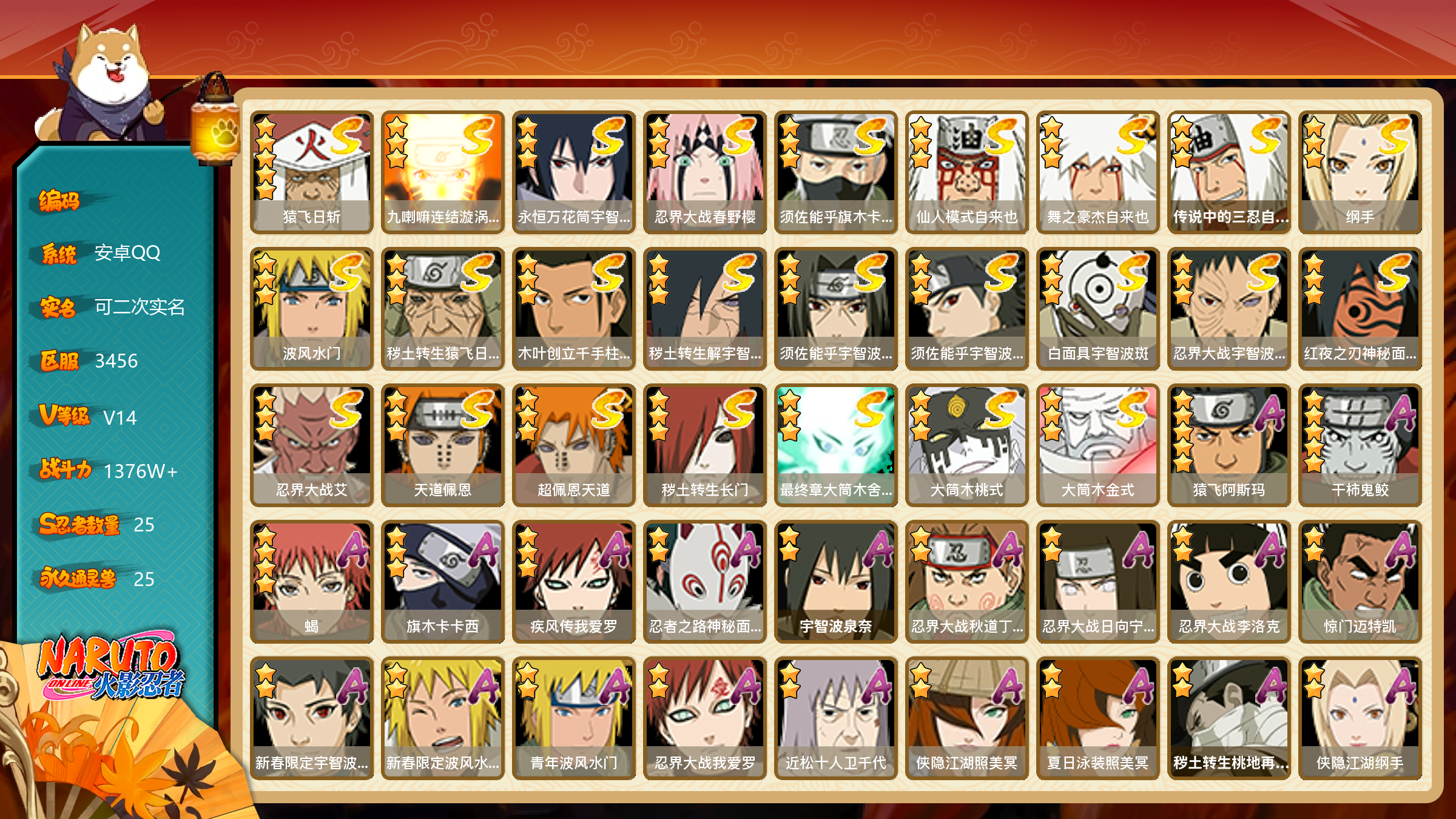 火影忍者【安卓QQ】战斗力:1376W+;段位:下忍2阶;本服排名:63;