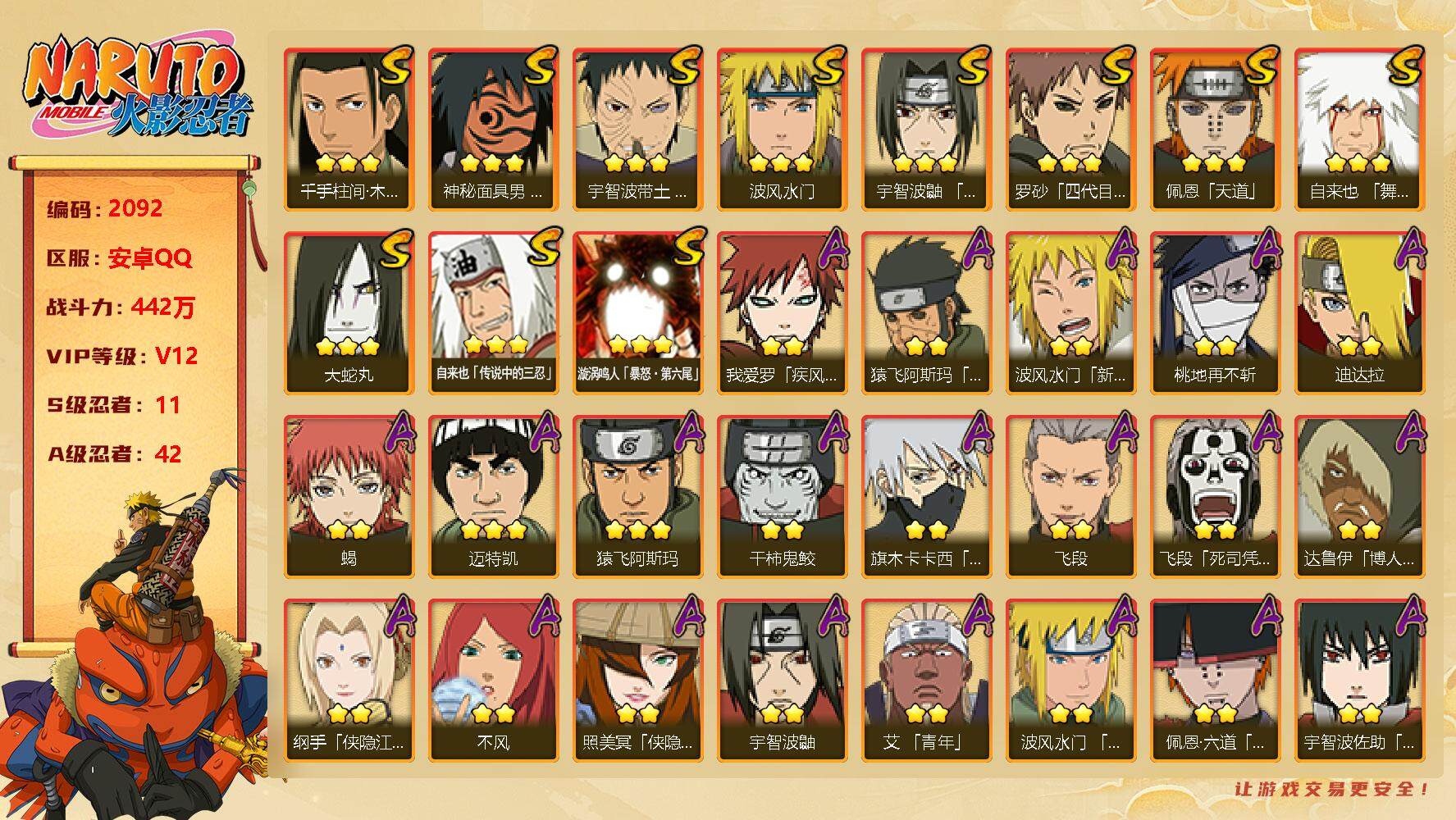 火影忍者【安卓QQ】v12,442w战力,11S级忍者数-42A级忍者数,秽土柱间54片,木叶创立