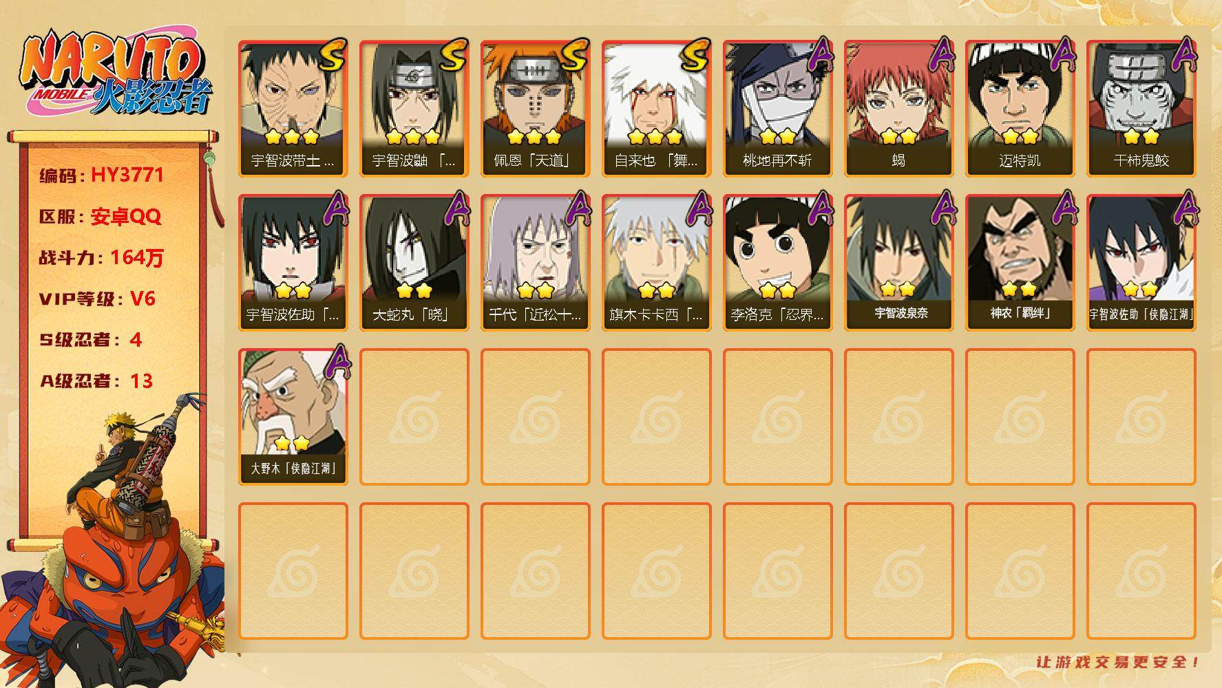火影忍者【安卓QQ】V6/战力164W/S忍4/A忍13/