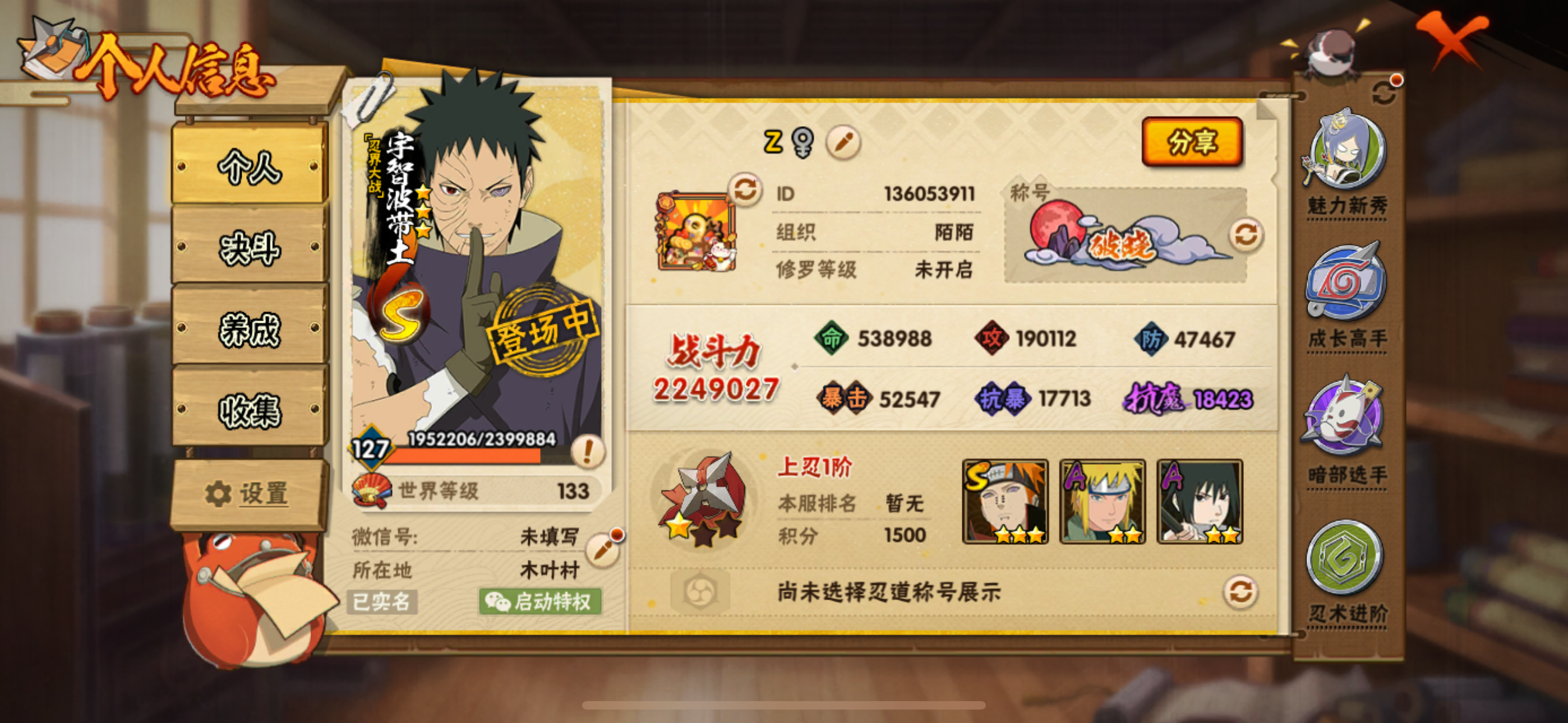贵族等级: V6 S忍数: 3 A忍数: 17 战力值(万): 513 S级忍