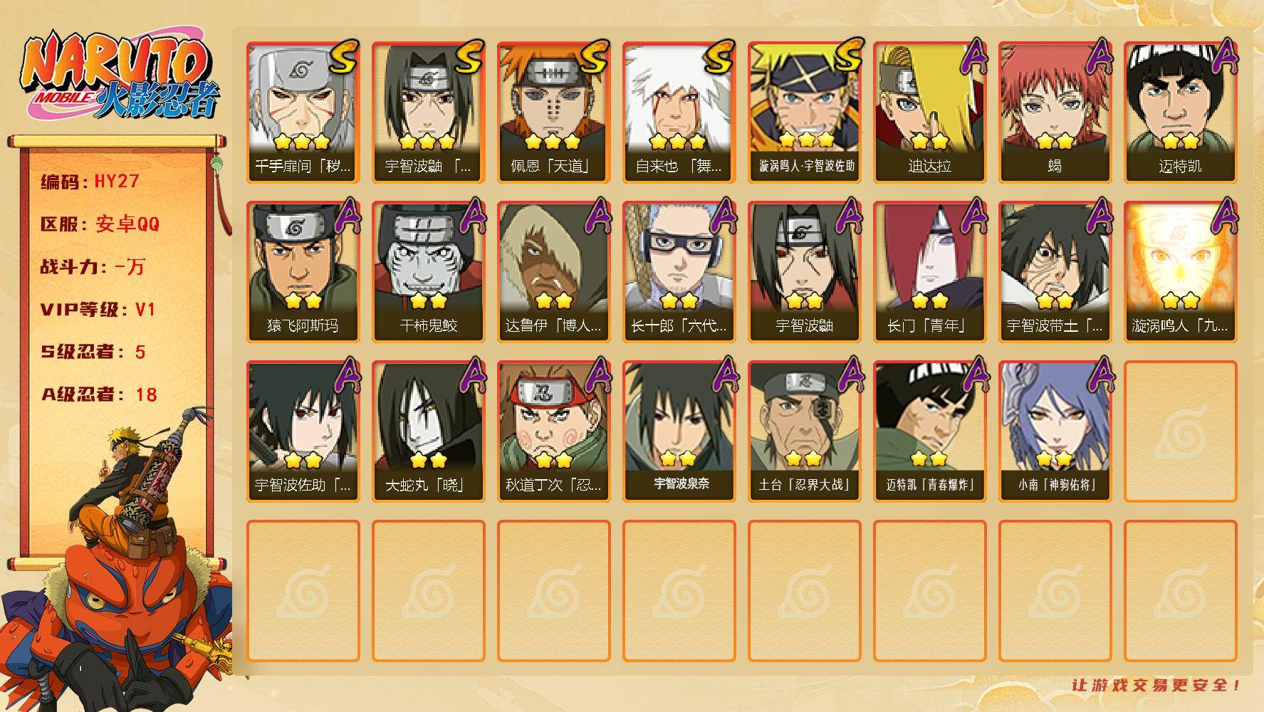 5S忍/15A忍/战力317W/V4/区服3939 【S忍者】宇智波佐助「漩涡鸣人」,宇智波斑「秽土转生·解」,自来也「舞之豪杰」,宇智波鼬「须佐能乎」,佩恩「天道」, 【 大蛇丸「晓」,飞段「S