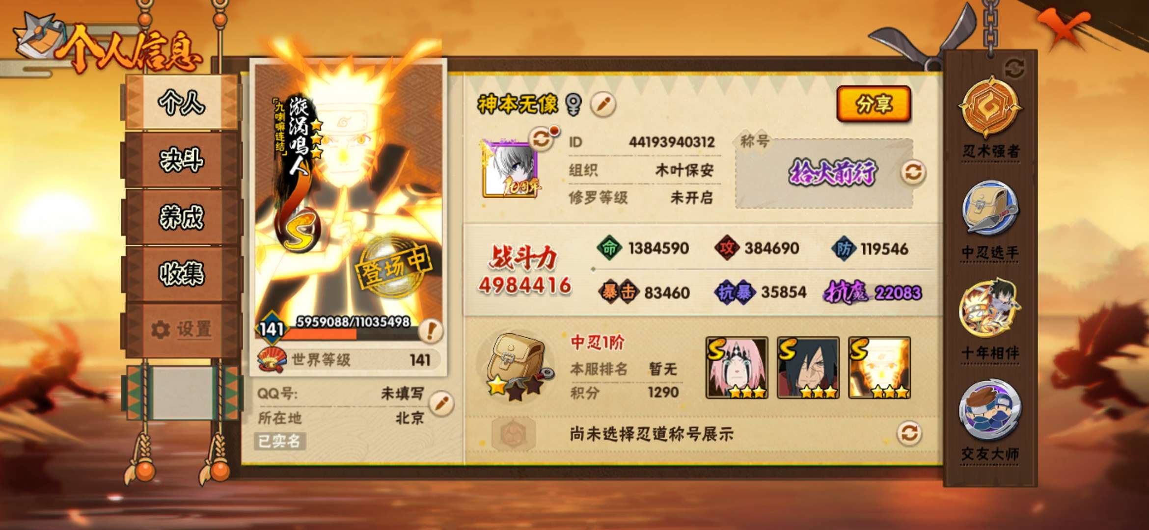 新区榜59!280w战力五影斑3s+5a战力280忍者总数4