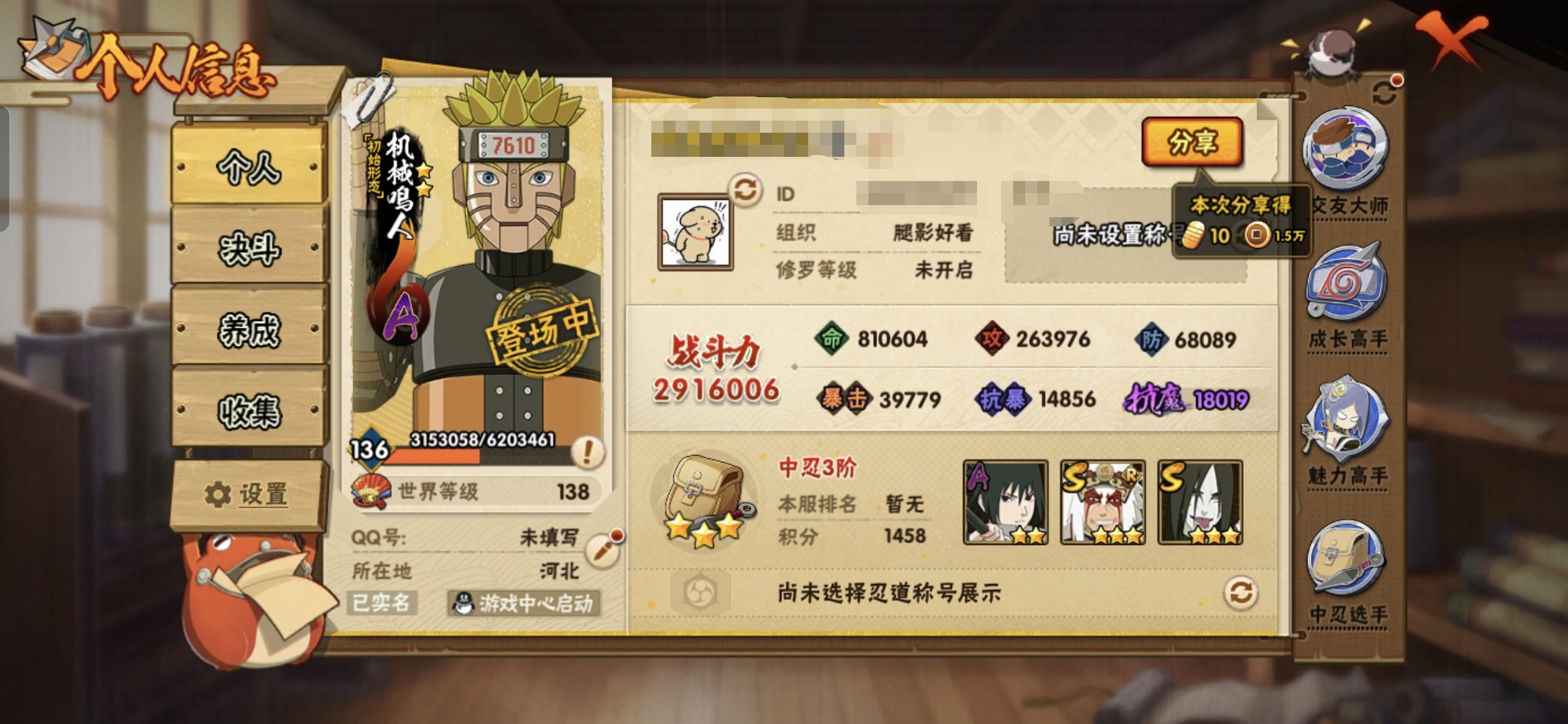 角色等级26 金币500 战斗力6000000 5星S忍者9 4 段位中忍