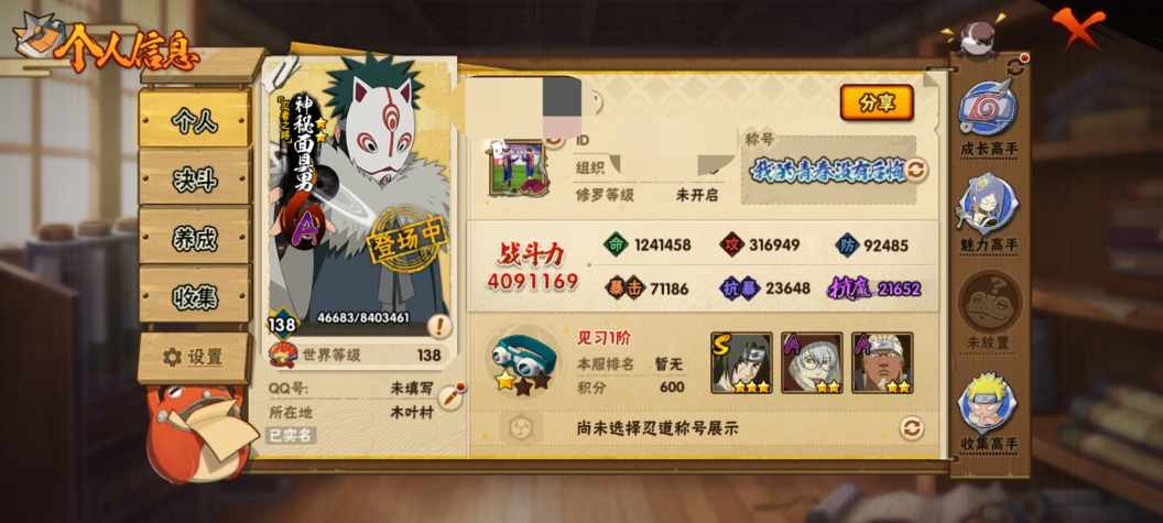 角色等级26 金币500 战斗力6000000 5星S忍者9 4 段位中忍