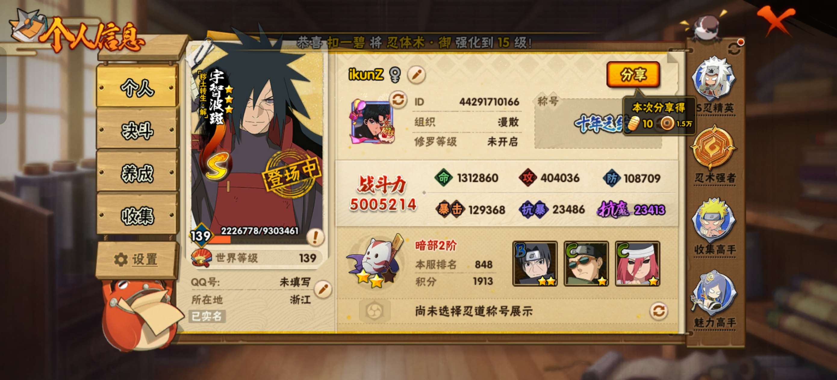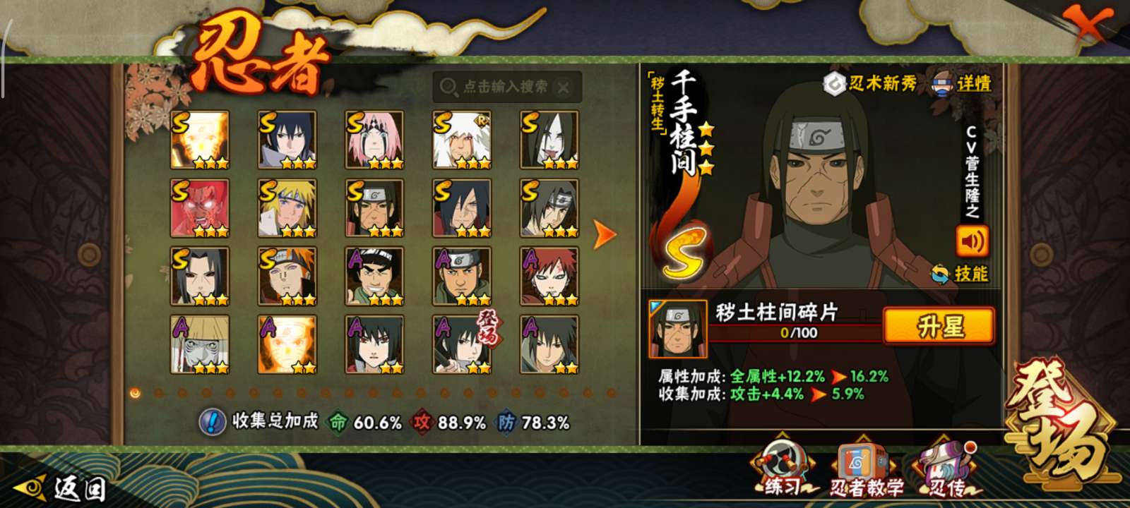 546W战力秽土斑忍战带土9S+面麻23A战力546忍者总数