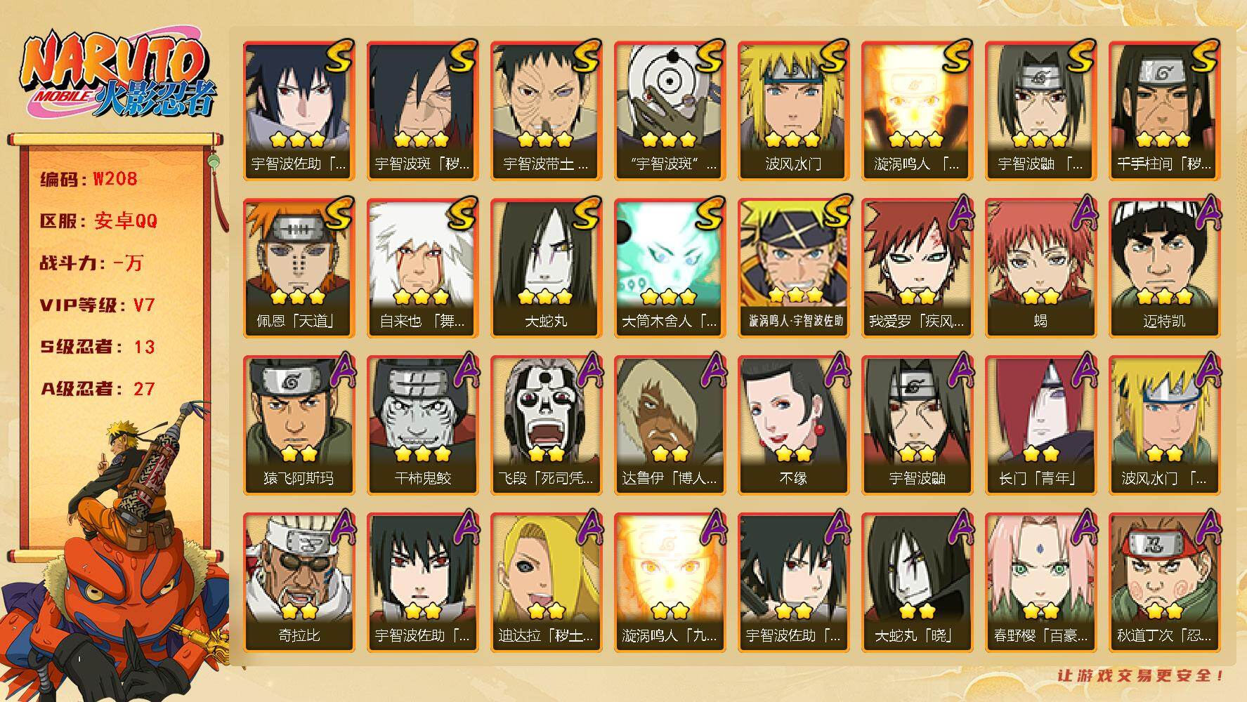 IOS/9S忍/30A忍/战力533W/V6/区服823 【S忍者】宇智波佐助「漩涡鸣人」,宇智波带土「忍界大战」,自来也「舞之豪杰」,旗木卡卡西「须佐能乎」,自来也「